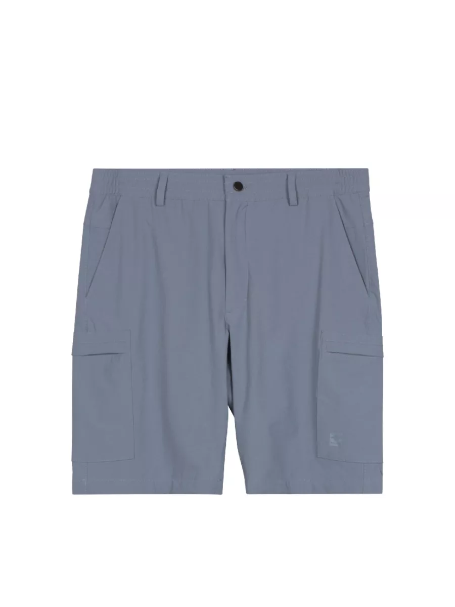Een luchtige cargo short van Baileys in een grijsblauw slate tint die een frisse, eigentijdse uitstraling heeft. Model 611058 heeft een relaxte pasvorm met een elastische tailleband met riemlussen en een knopsluiting. De cargozakken met klep aan beide zijkanten geven de short een praktisch en uitgesproken karakter. Een subtiel logopatch op het rechterbeen is het afwerkingsdetail. De grijsblauwe tint is wat zachter en neutraler dan een klassiek marineblauw, wat hem goed combineerbaar maakt met zowel koele als warme kleuren. De stof van nylon met elastaan is licht, goed rekbaar en sneldrogend, ideaal voor warme dagen waarop je veel beweegt of op pad bent.