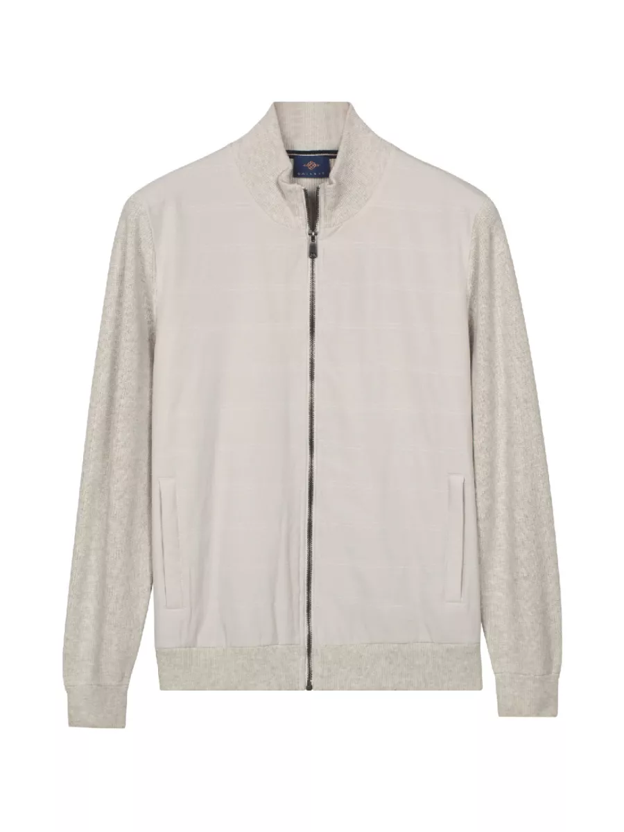 Een vest van Baileys met een opvallend materiaalcontrast dat dit stuk direct onderscheidt van een doorsnee zip-through. Model 612019 heeft een glad, licht gestructureerd voorpand in zandbeige, terwijl de mouwen zijn uitgevoerd in een fijngebreide structuurstof in een subtiel grijs-beige tint. Dat samenspel van twee textures geeft het vest een eigentijds karakter. De opstaande ribkraag, de doorgaande rits en de twee insteekvakken aan de voorzijde geven het stuk een clean, functioneel silhouet. De ribboord en ribmanchetten sluiten het vest netjes af. Draag hem over een T-shirt of licht overhemd voor een relaxte maar verzorgde look. Volledig van katoen, wat zorgt voor een prettig draaggevoel en een goede luchtigheid in het voorjaar.