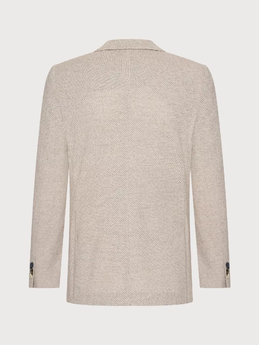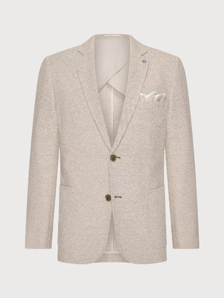 Een zomerse colbert van Blue Industry die net zo goed past bij een nette gelegenheid als bij een relaxte smart casual look. Het model JBIS26-M2 heeft een lossere, ongestructureerde constructie met twee knopen en een borstzakje met pochette, details die het jasje een lichte, Italiaans geïnspireerde uitstraling geven. De geweven stof in zandbeige heeft een subtiele textuur die diepte geeft zonder opdringerig te zijn. Draag hem op een lichte chino of gecombineerd met de bijpassende pantalon voor een volledig ensemble. Het materiaal combineert katoen met lyocell. Katoen geeft het weefsel structuur en stevigheid, terwijl lyocell een lichte draperingskwaliteit toevoegt die de jas er altijd verzorgd uit laat zien, ook na een lange dag. De binnenkant is licht gevoerd in een diagonaal patroon, wat bijdraagt aan het draagcomfort. Een veelzijdig jasje dat je de hele zomer mee vooruit kunt.