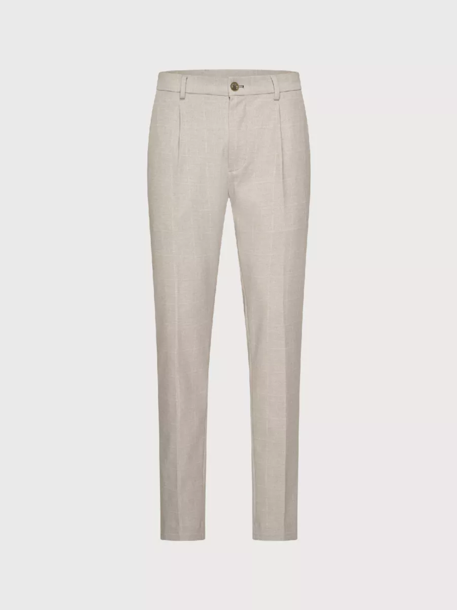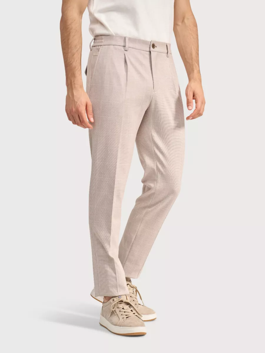 Een nette, lichte pantalon van Blue Industry die comfort en stijl moeiteloos combineert. De Stevens heeft een slanke, getailleerde pasvorm met een subtiele plooi aan de voorzijde die de broek een klassiek, gekleed karakter geeft. De zandbeige kleur is tijdloos en veelzijdig: combineer hem met een bijpassend colbert voor een volledig ensemble, of draag hem apart op een overhemd of overshirt voor een smart casual dagelijkse look. Het weefsel heeft een lichte melange-structuur die de kleur extra diepte geeft. De stofmix van polyester, viscose en een vleugje elastaan zorgt voor een uitstekende pasvorm die meegaat in beweging, weinig kreukt en de hele dag zijn vorm behoudt. De tailleband is netjes afgewerkt met riemlussen en een sierknoop.
