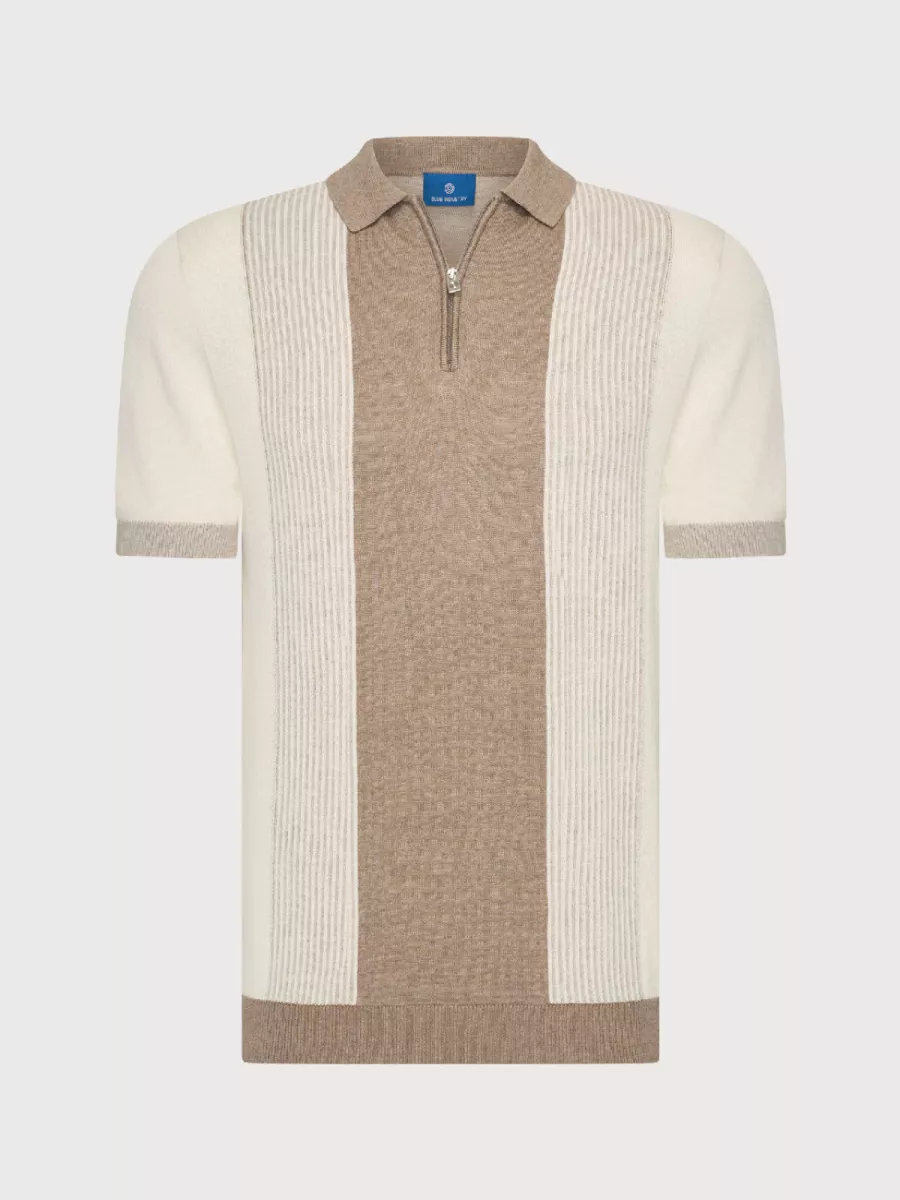 Deze beige polo van Blue Industry heeft verticale banen in verschillende breisels die het shirt een interessant patroon geven. De polo heeft een klassieke kraag en een korte ritssluiting. De afwisseling van gestructureerde en gladde banen zorgt voor een gevarieerde textuur. De korte mouwen hebben geribbelde boorden. Je combineert deze polo gemakkelijk met een chino of pantalon voor een verzorgde casual look. De beige kleur is neutraal en geschikt voor verschillende seizoenen. De mix van katoen en modal zorgt voor een zachte stof met aangenaam draagcomfort.