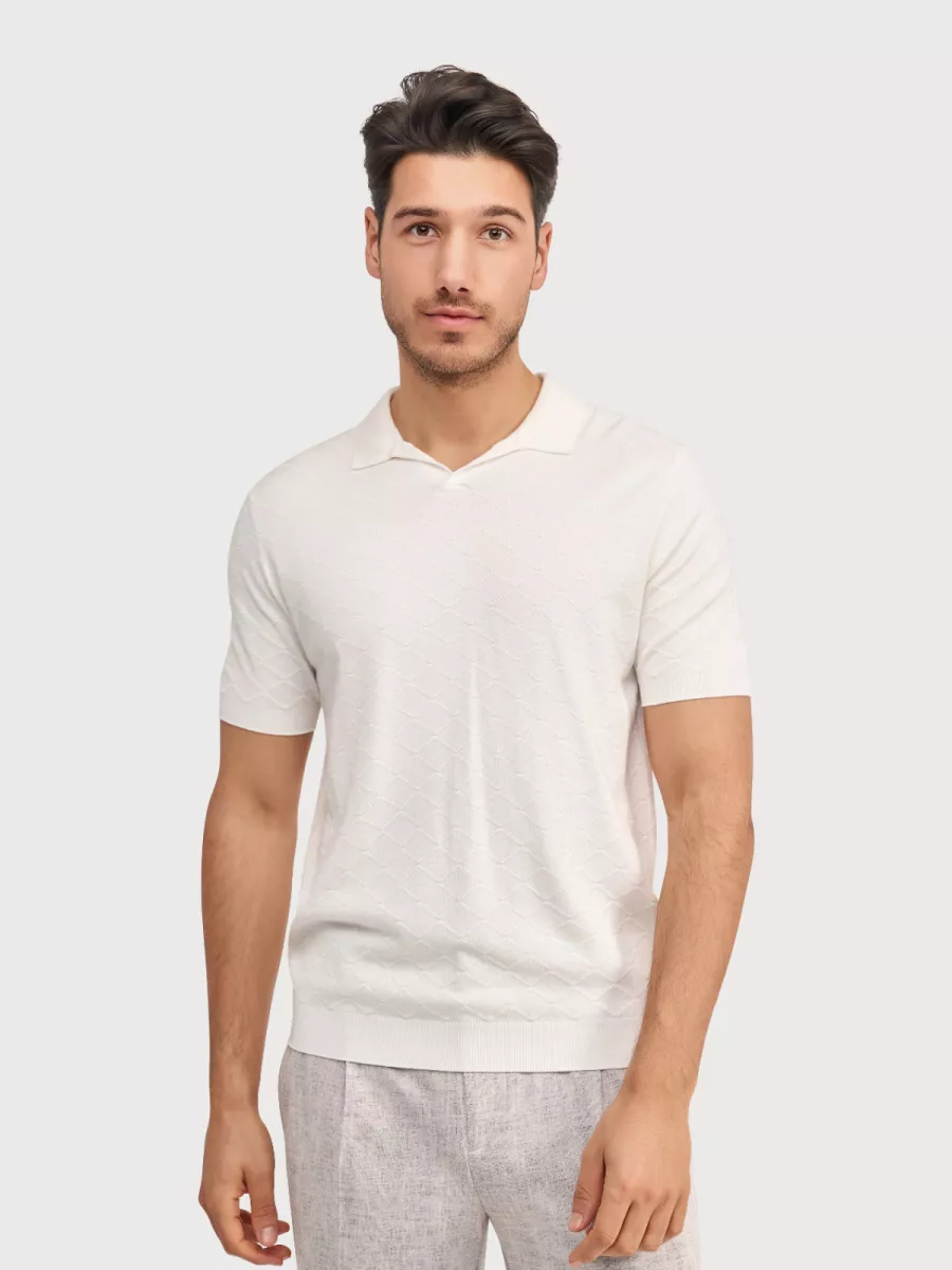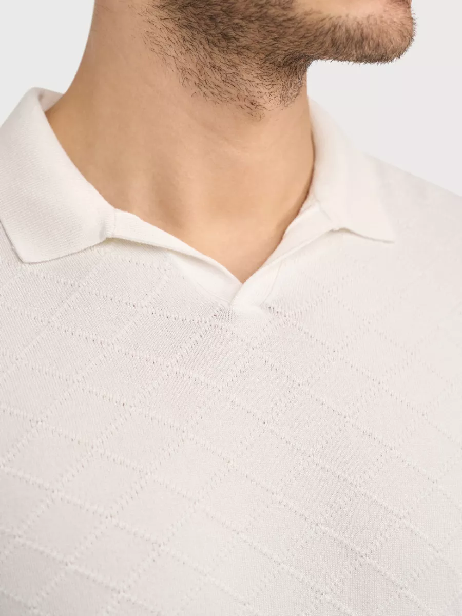 Deze beige polo van Blue Industry heeft een gestructureerde stof die het shirt een luxe uitstraling geeft. De polo heeft een klassieke kraag met knoopsluiting en een V-hals opening. Het reliëf in de stof zorgt voor extra dimensie en een interessante textuur. De korte mouwen zijn afgewerkt met geribbelde boorden. Je draagt deze polo gemakkelijk bij verschillende gelegenheden, van casual tot iets netter. De beige kleur is neutraal en veelzijdig te combineren. Het viscose materiaal voelt zacht aan en heeft een soepele pasvorm.