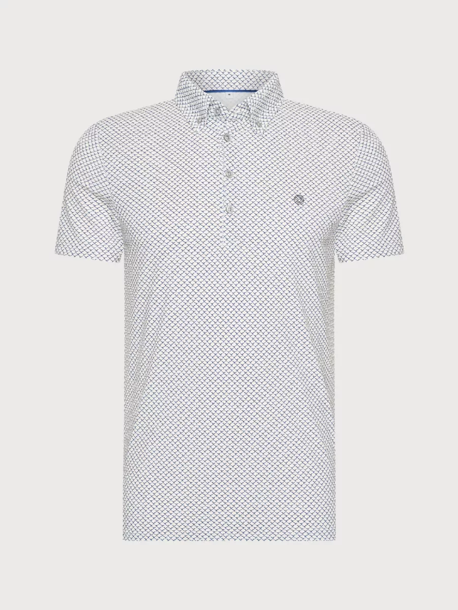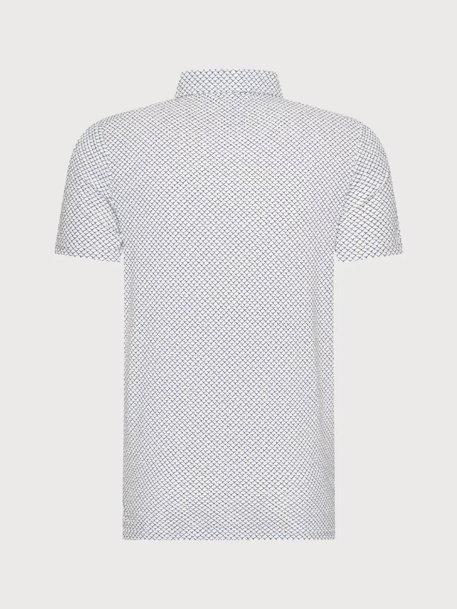 Een polo van Blue Industry met een fijnmazig allover-printje op een gebroken witte ondergrond. Model KBIS26-M26 heeft een slim fit-pasvorm met korte mouwen en een button-down kraag, afgewerkt met een subtiel blauw binnenstukje bij de kraagboord, een kenmerkend detail van het merk. Het fijne schubvormige patroon in marineblauw en wit geeft het shirt een geordende, nette uitstraling die het midden houdt tussen een bedrukt shirt en een klassieke polo. Op de borst is een klein geborduurd merklogo aangebracht. De stof van nylon met spandex zit soepel, beweegt goed mee en kreukelt nauwelijks. Draag hem op een donkere chino of jeans voor een frisse, verzorgde look.