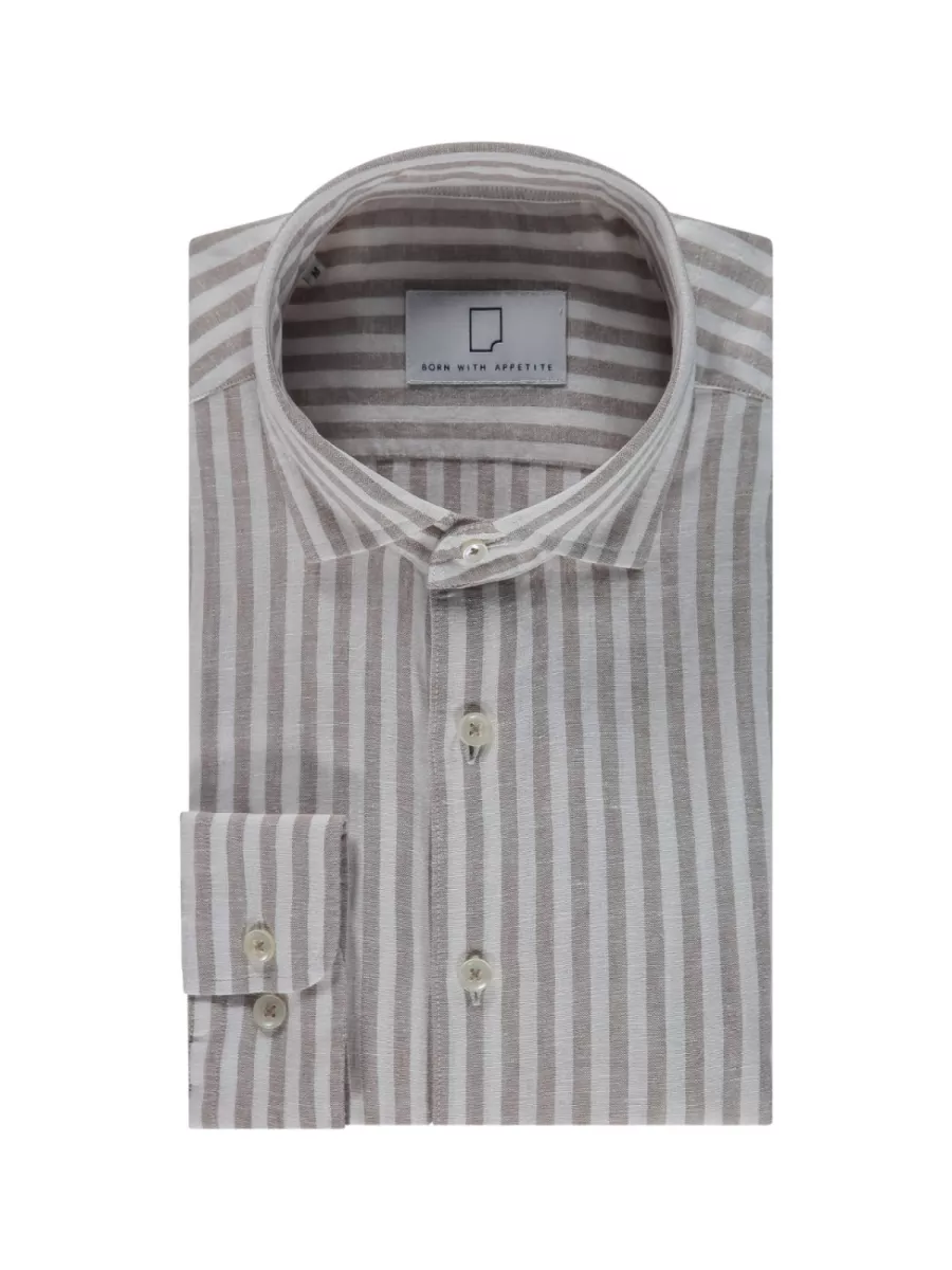 Een gestreept overhemd van Born with Appetite met brede strepen in tabacco-bruin en gebroken wit. Model BWA26107AV02 heeft een slim fit-snit met een brede cutaway-kraag en parelmoerkleurige knopen die goed afsteken bij de lichte strepen. De brede, regelmatige strepen geven het shirt een zomers, ontspannen karakter dat werkt zowel in casual als smart casual context. De manchetten zijn afgewerkt met een enkelvoudige manchetknoop. De mix van linnen en katoen geeft het shirt een lichte, ademende kwaliteit met de natuurlijke textuur die linnen eigen is. Draag hem op een beige of witte chino voor een complete zomerlook, of open over een wit T-shirt voor een relaxter resultaat.