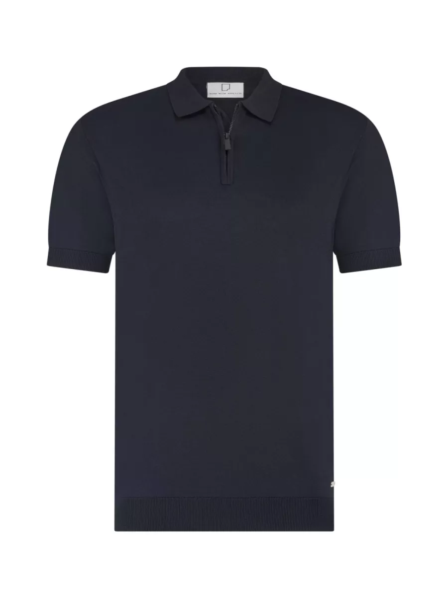 Een gebreide polo van Born with Appetite in een diep marineblauw met een glad, fijn breiwerk en een kwart-rits als sluiting. Model BWA00006DA31 heeft een regular fit-pasvorm met korte mouwen en een klassieke polokraag. De kwart-rits is uitgevoerd in een donkere tint die toon-op-toon aansluit bij de marineblauwe stof, wat het geheel een strakke, cleane uitstraling geeft. De ribmanchetten en de brede ribboord aan de onderzijde sluiten het shirt netjes af. De stof van viscose en nylon heeft een soepele, licht glanzende kwaliteit die het breiwerk een verfijnde uitstraling geeft en aangenaam draagt op de huid. Marineblauw combineert moeiteloos met beige, wit of lichtgrijs voor een verzorgde zomerlook.