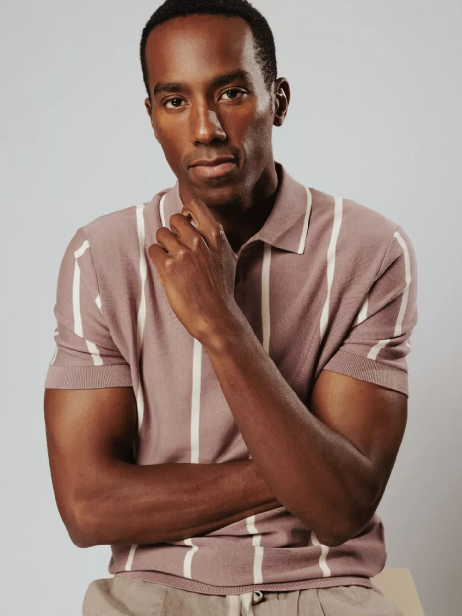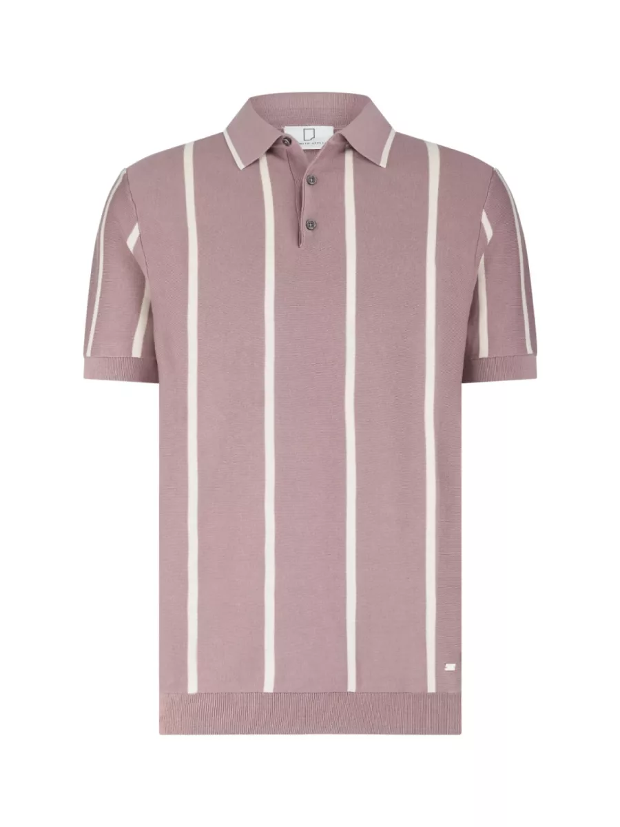 Een gebreide polo van Born with Appetite met een uitgesproken verticaal streeppatroon in een gedempte roze-paars tint en gebroken wit. Model BWA26106GI53 heeft een regular fit-pasvorm met korte mouwen, een klassieke polokraag en een twee-knoopsluiting met donkere knopen. De brede verticale strepen geven dit shirt een retro-geïnspireerde uitstraling met een eigentijds kleurenpalet. De brede ribboord aan de onderzijde en de ribmanchetten sluiten het geheel strak af. De mix van katoen, zijde en linnen geeft het breiwerk een aangename zachtheid en een lichte glans. De gedempte roze-paars tint combineert goed met gebroken witte, beige of grijze broeken voor een opvallende maar evenwichtige zomerlook.