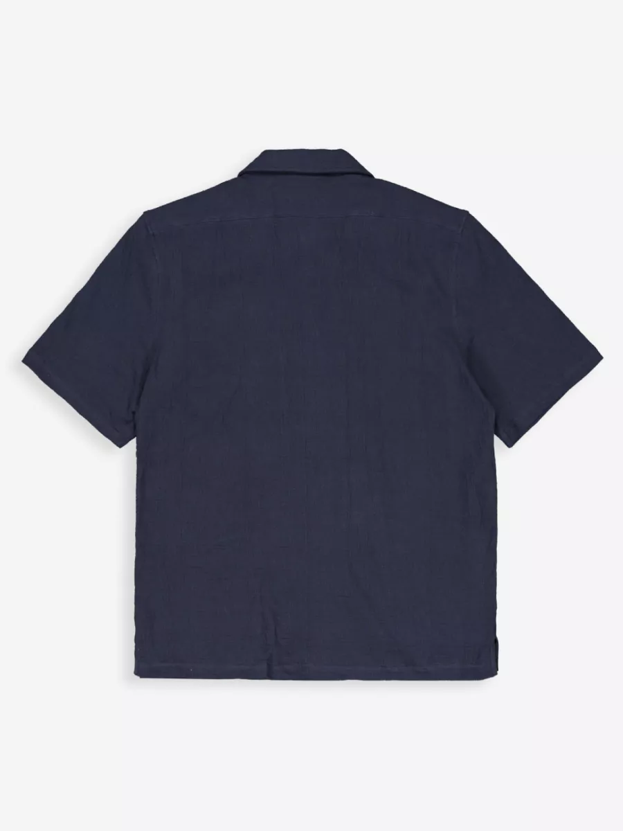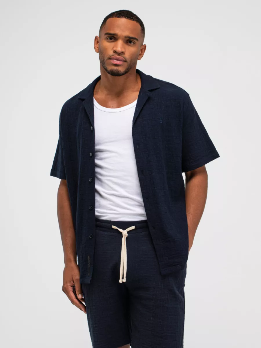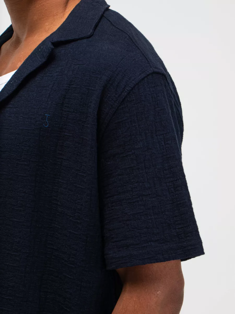 Een relaxed overhemd van Butcher of Blue in een diep marineblauw met een boxy, lossere pasvorm en korte mouwen. Model M2516059 heeft een brede camp/resort kraag die open over de revers valt, wat het shirt een zomerse, ontspannen uitstraling geeft die dicht bij een licht jackmodel komt. De knopsluiting loopt door tot onder en is voorzien van donkere knopen die toon-op-toon aansluiten bij de marineblauwe stof. De stof heeft een lichte textuur die zichtbaar is in het weefsel. De korte mouw en de boxy snit maken dit shirt uitstekend draagbaar in het warme seizoen. Draag hem open over een T-shirt voor een gelaagde look, of dicht op een lichte chino voor een complete zomerse outfit.