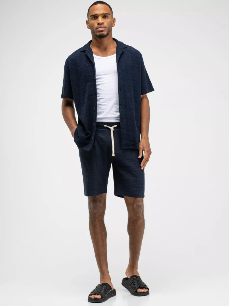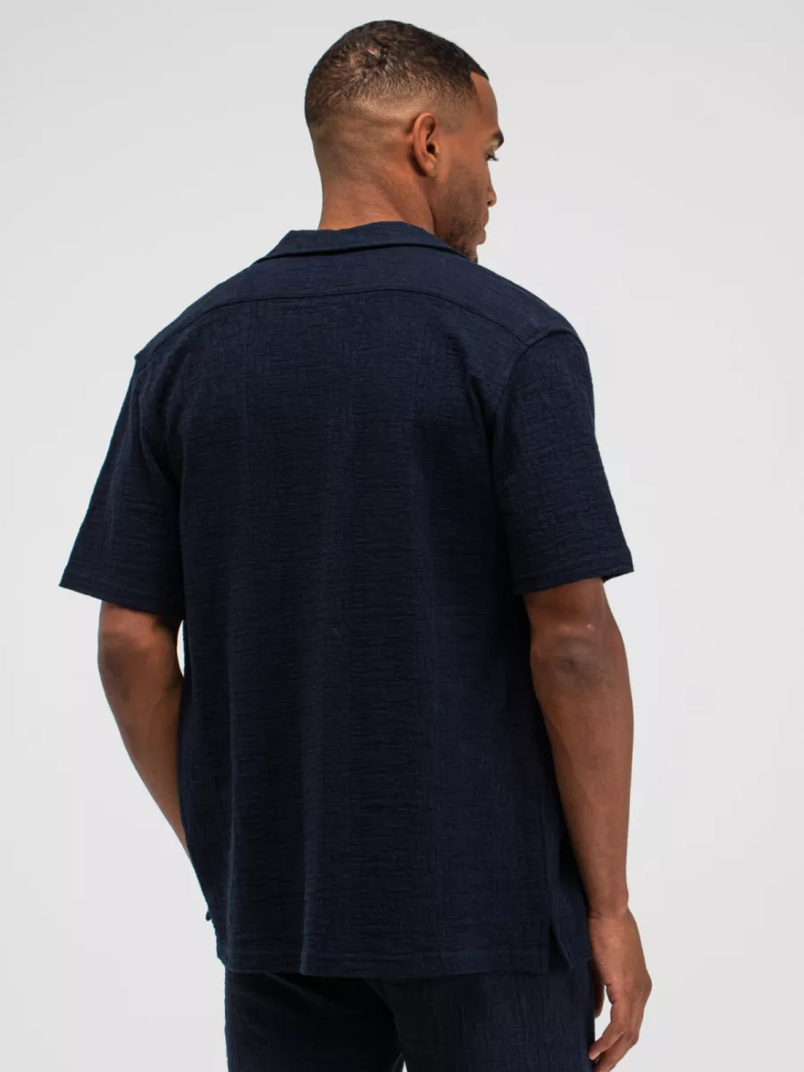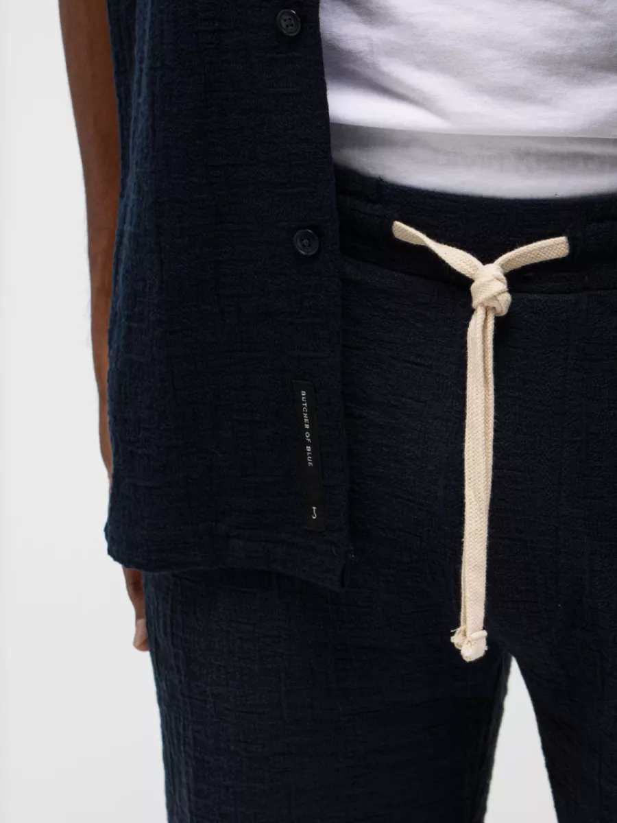 Een relaxed overhemd van Butcher of Blue in een diep marineblauw met een boxy, lossere pasvorm en korte mouwen. Model M2516059 heeft een brede camp/resort kraag die open over de revers valt, wat het shirt een zomerse, ontspannen uitstraling geeft die dicht bij een licht jackmodel komt. De knopsluiting loopt door tot onder en is voorzien van donkere knopen die toon-op-toon aansluiten bij de marineblauwe stof. De stof heeft een lichte textuur die zichtbaar is in het weefsel. De korte mouw en de boxy snit maken dit shirt uitstekend draagbaar in het warme seizoen. Draag hem open over een T-shirt voor een gelaagde look, of dicht op een lichte chino voor een complete zomerse outfit.