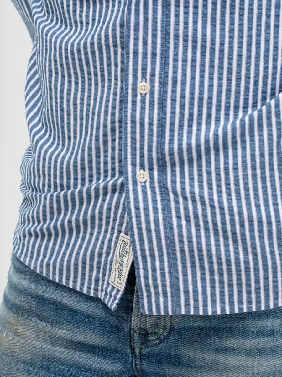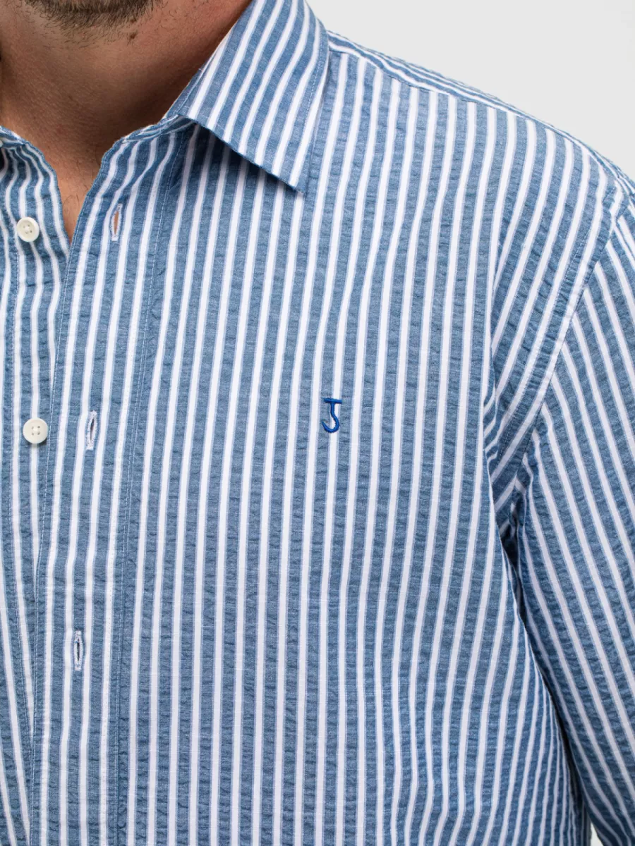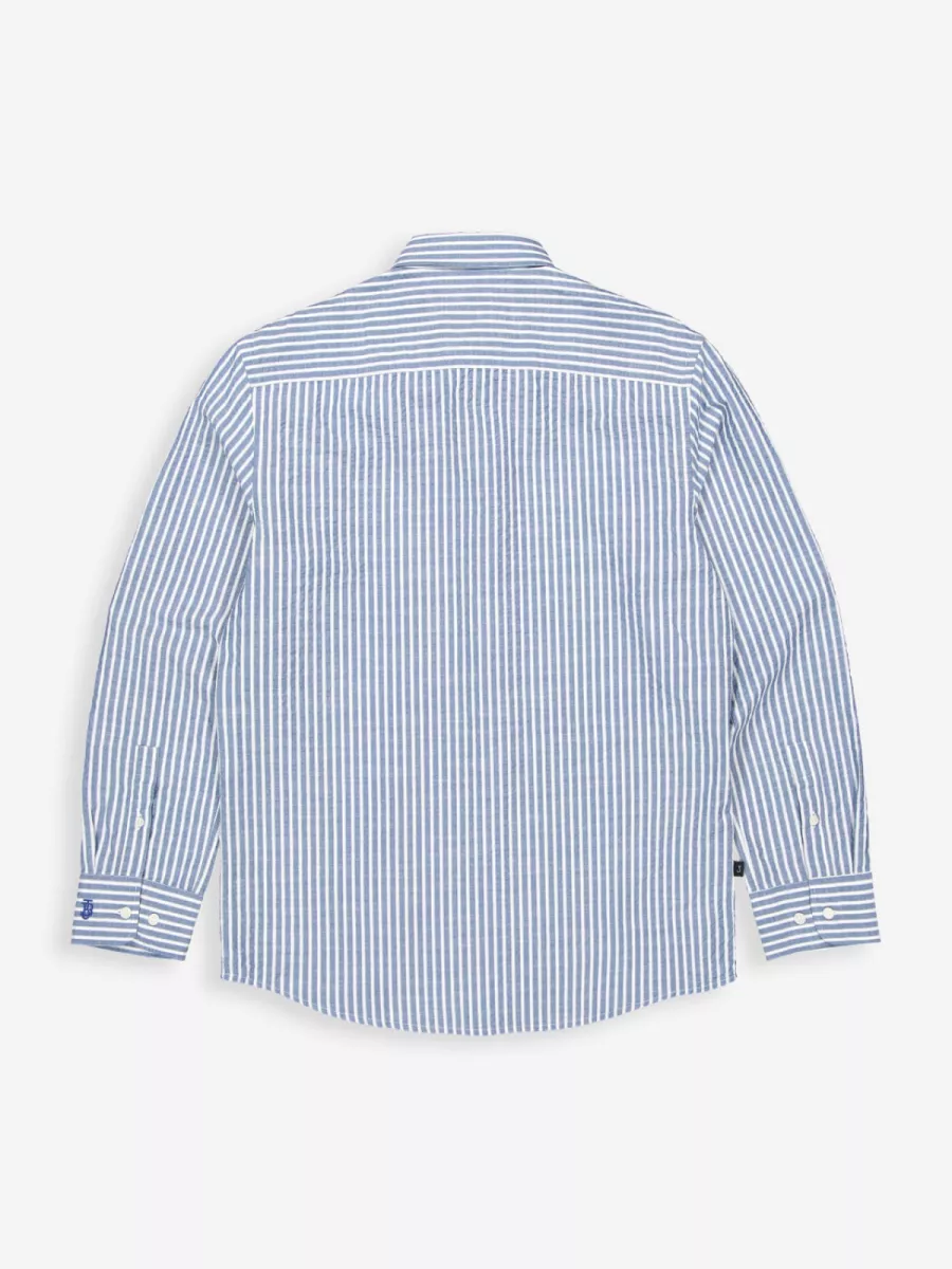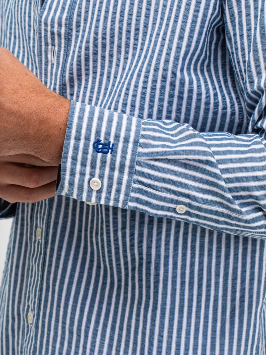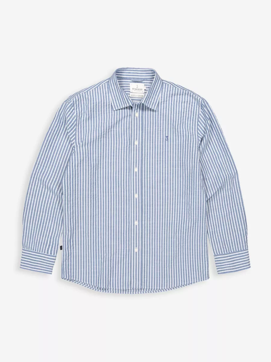 Een gestreept overhemd van Butcher of Blue in blauw en wit met een seersucker structuur die het shirt een lichte, geribbelde textuur geeft. Model M2614009 heeft een regular fit-pasvorm met lange mouwen en een klassieke Kent-kraag. De brede afwisselende strepen in middenblauw en wit geven het shirt een frisse, zomerse uitstraling. Op de borst is een subtiel geborduurd haakmotief aangebracht. De manchetten zijn afgewerkt met een knoop. De seersucker stof van katoen is licht en ademend van nature, wat het shirt bijzonder draagbaar maakt in warme weersomstandigheden. Draag hem op een witte of beige chino voor een complete look, of open over een T-shirt voor een meer casual resultaat.