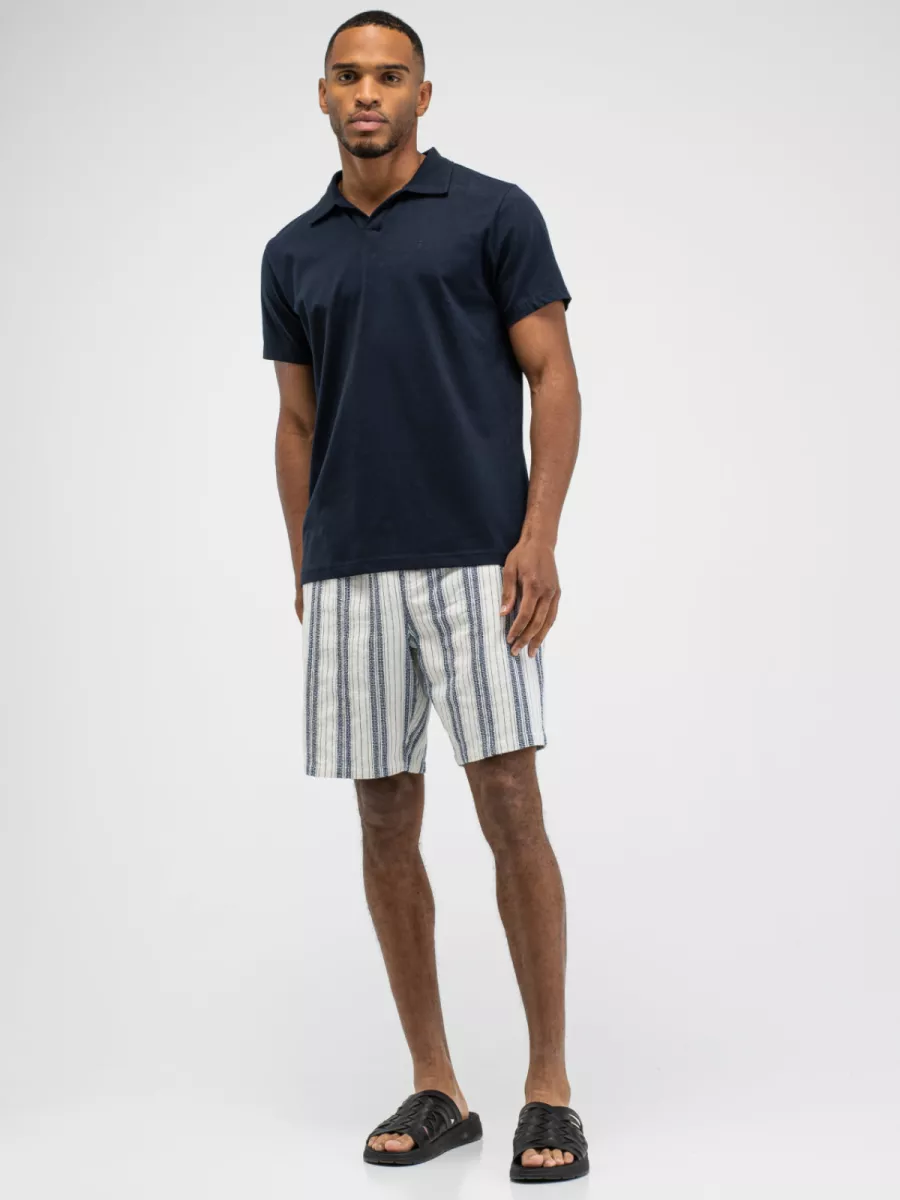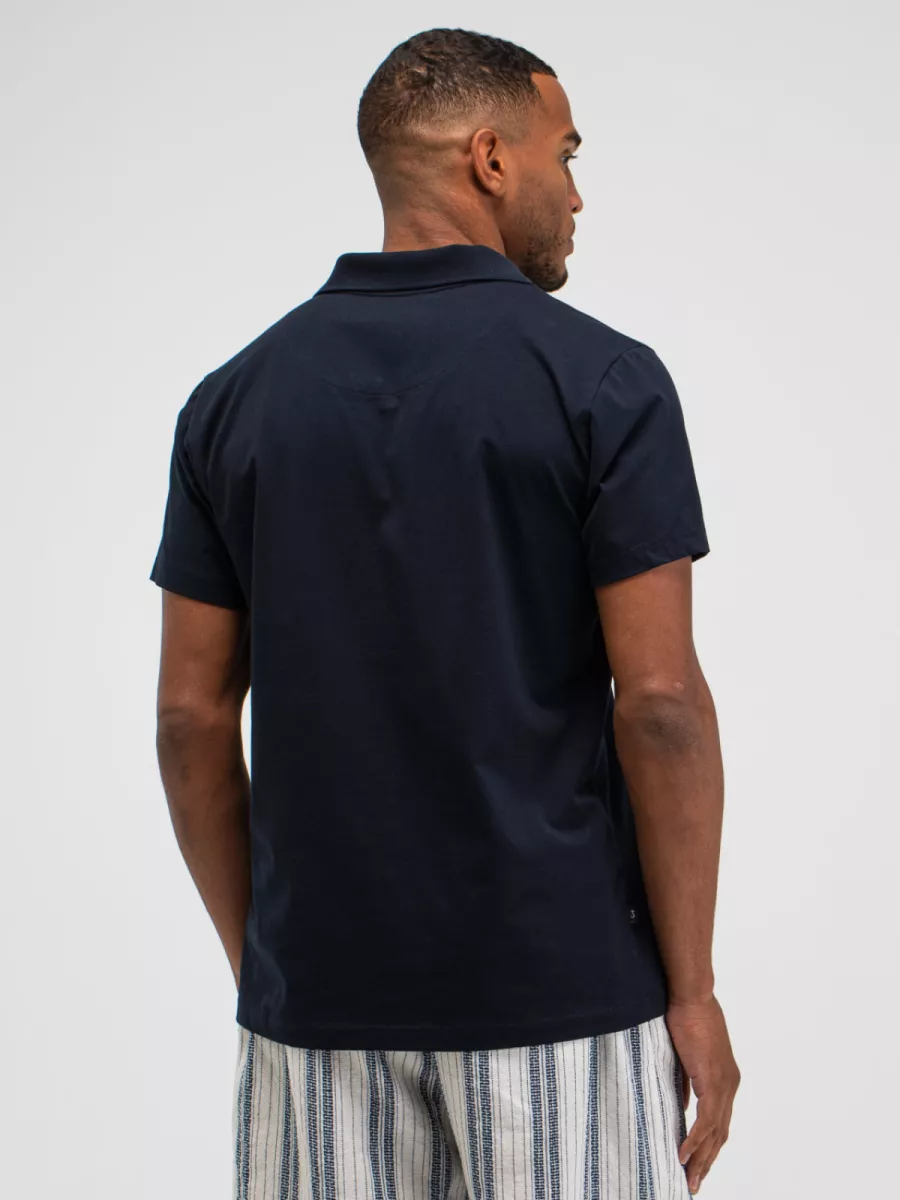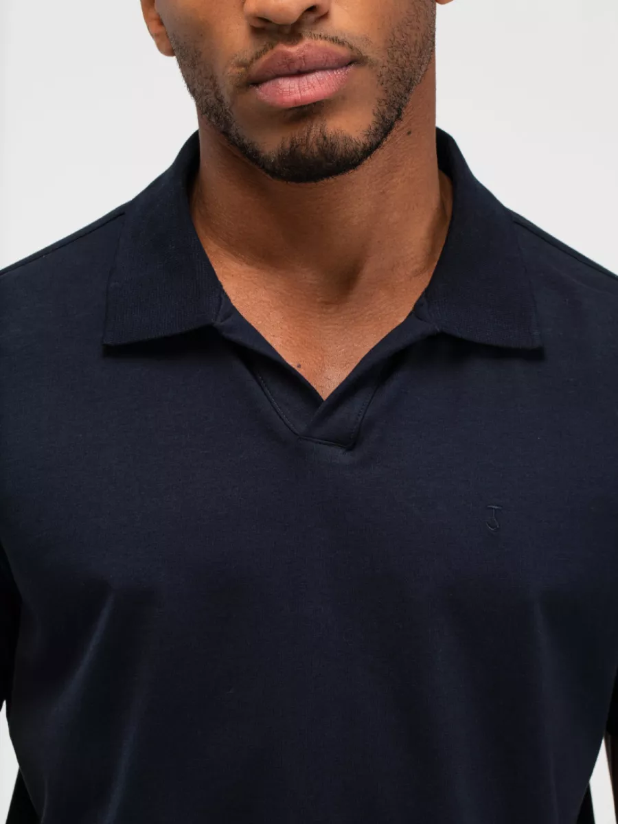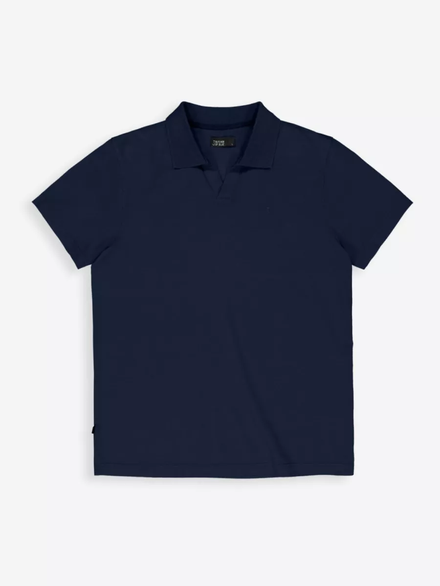 Een effen polo van Butcher of Blue in een diep marineblauw met een glad piqué weefsel en een open Italiaanse kraag zonder knopen. Model M2613030 heeft een regular fit-pasvorm met korte mouwen. De open kraag zonder sluiting geeft het shirt een relaxte, mediterrane uitstraling die het midden houdt tussen een polo en een shirt. Op de borst is een subtiel geborduurd logomotief aangebracht. Aan de zijnaad bevindt zich een klein woven merklabel. De stof van biologisch katoen heeft een fijn piqué weefsel dat zorgt voor een goede luchtigheid en een prettig draaggevoel. Marineblauw is een tijdloze keuze die moeiteloos combineert met beige, wit of lichtgrijze broeken voor een verzorgde maar ontspannen zomerlook.