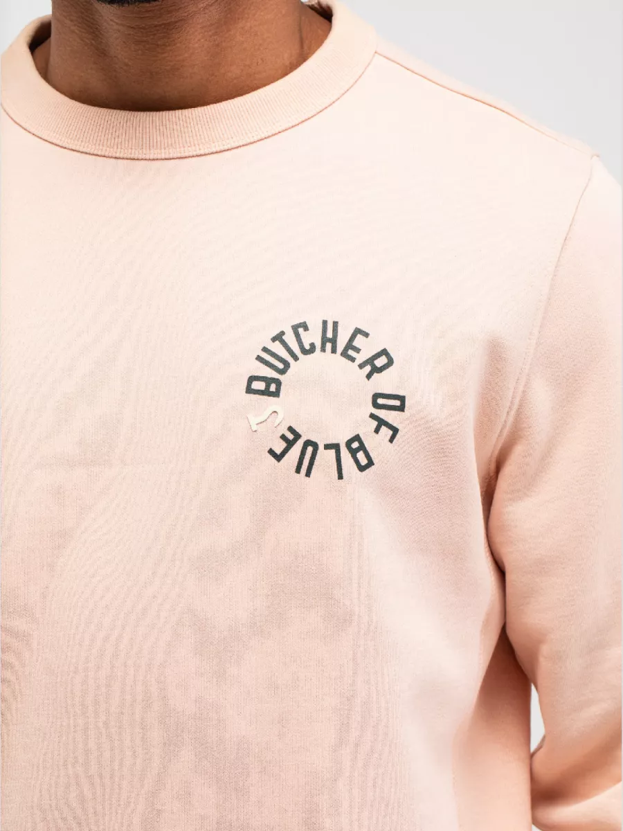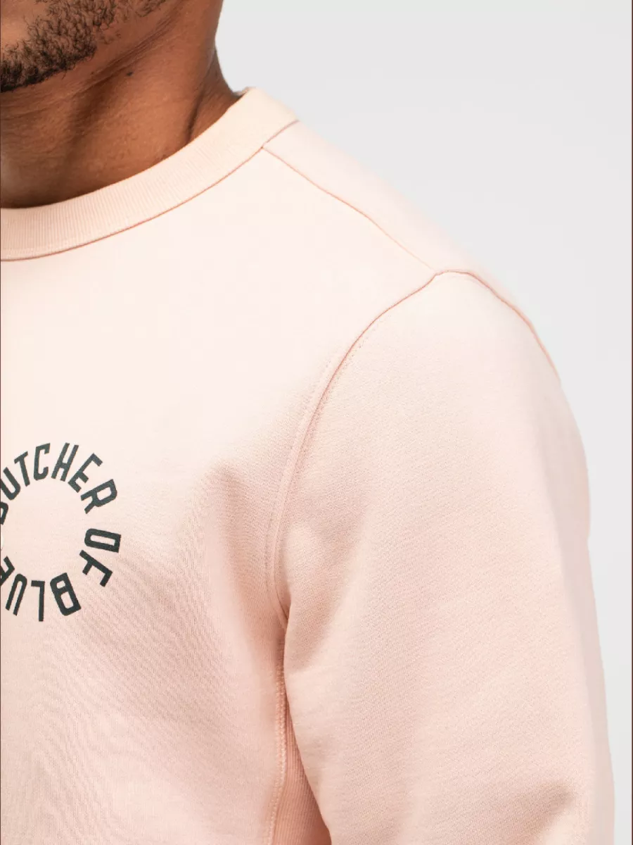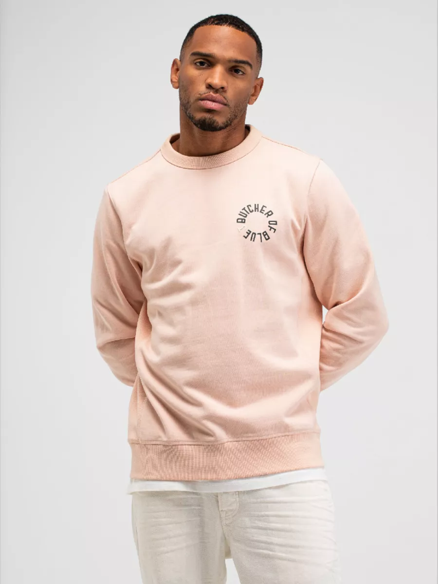 Deze roze sweater van Butcher of Blue heeft een cirkelprint op de borst met de tekst BUTCHER OF BLUE. Het merk richt zich op mannen die op zoek zijn naar duurzame kledingstukken die jarenlang meegaan. De sweater heeft een ronde hals met geribbelde afwerking en lange mouwen. De print is uitgevoerd in een donkere kleur die goed zichtbaar is op de lichte achtergrond. De manchetten en zoom zijn afgewerkt met geribbelde boorden. Je draagt deze sweater gemakkelijk in je vrije tijd of tijdens casual afspraken. De zachte roze kleur is eigentijds en gemakkelijk te combineren. Het biologisch katoen voelt comfortabel aan en biedt voldoende warmte voor de koelere dagen.