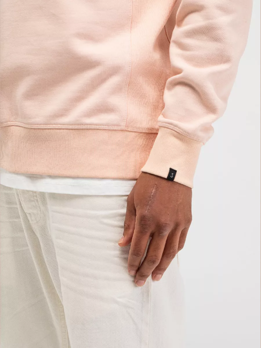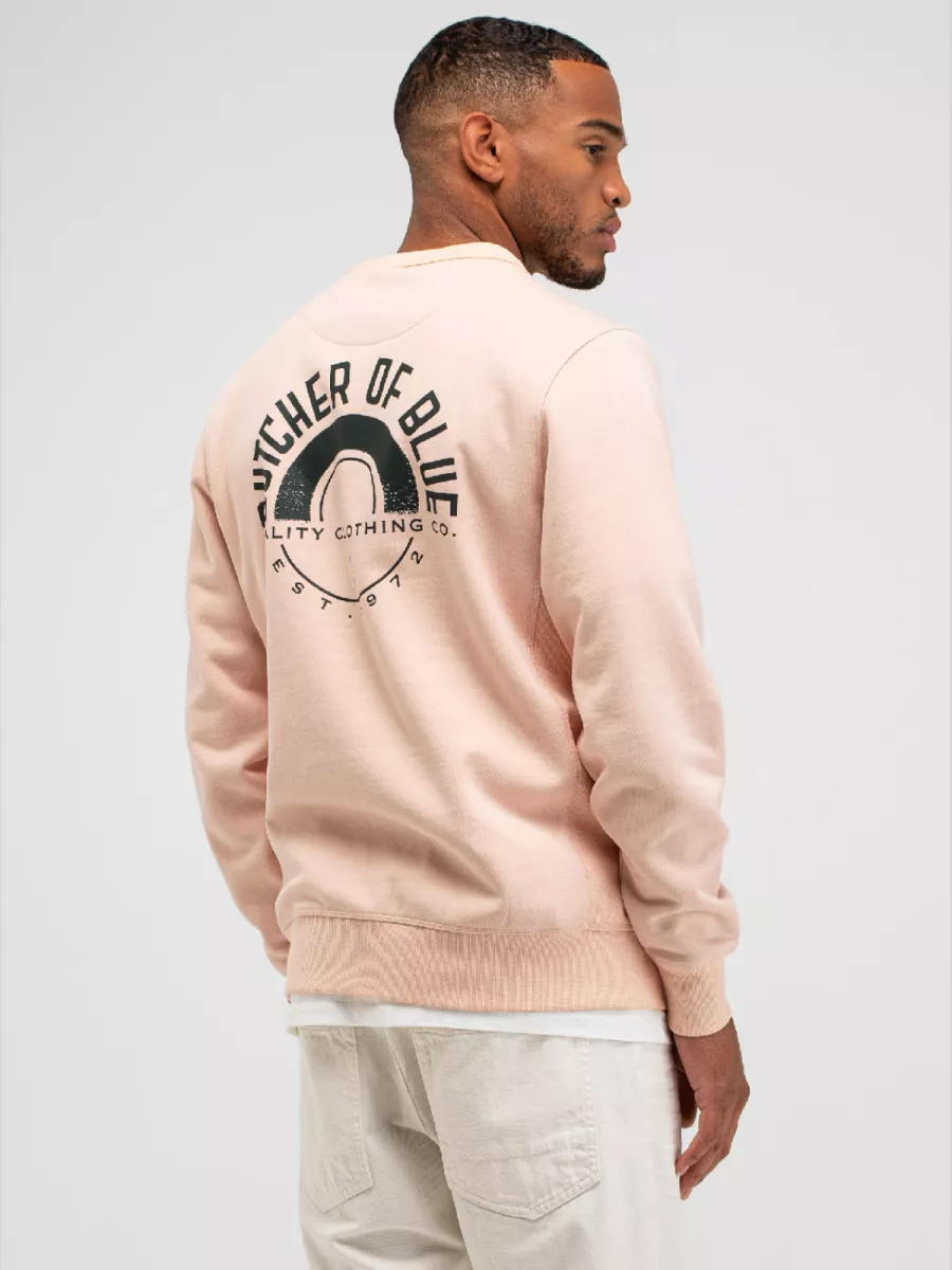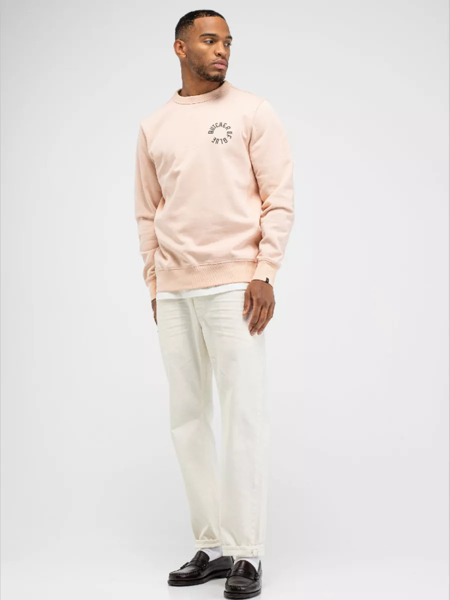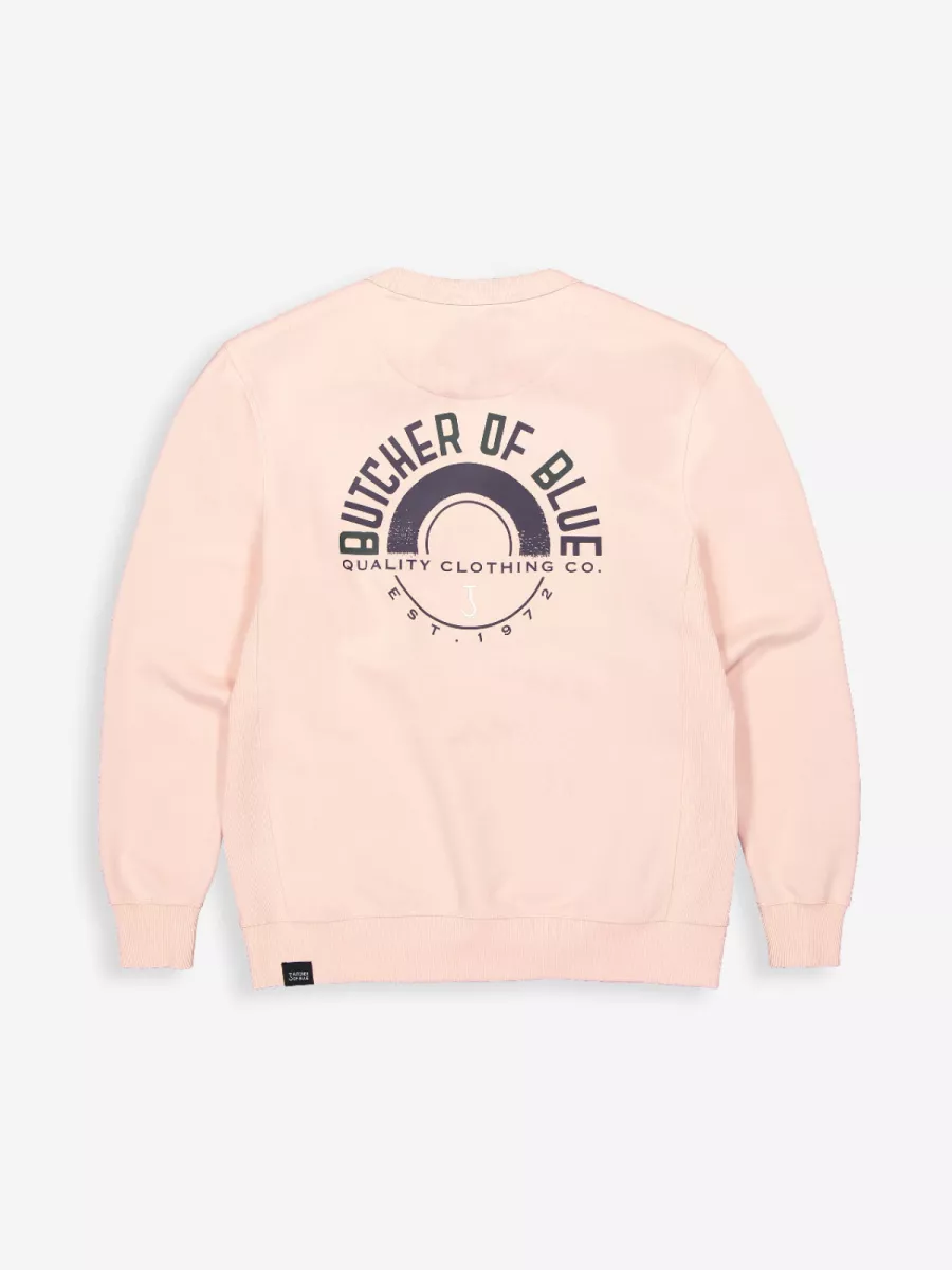 Deze roze sweater van Butcher of Blue heeft een cirkelprint op de borst met de tekst BUTCHER OF BLUE. Het merk richt zich op mannen die op zoek zijn naar duurzame kledingstukken die jarenlang meegaan. De sweater heeft een ronde hals met geribbelde afwerking en lange mouwen. De print is uitgevoerd in een donkere kleur die goed zichtbaar is op de lichte achtergrond. De manchetten en zoom zijn afgewerkt met geribbelde boorden. Je draagt deze sweater gemakkelijk in je vrije tijd of tijdens casual afspraken. De zachte roze kleur is eigentijds en gemakkelijk te combineren. Het biologisch katoen voelt comfortabel aan en biedt voldoende warmte voor de koelere dagen.