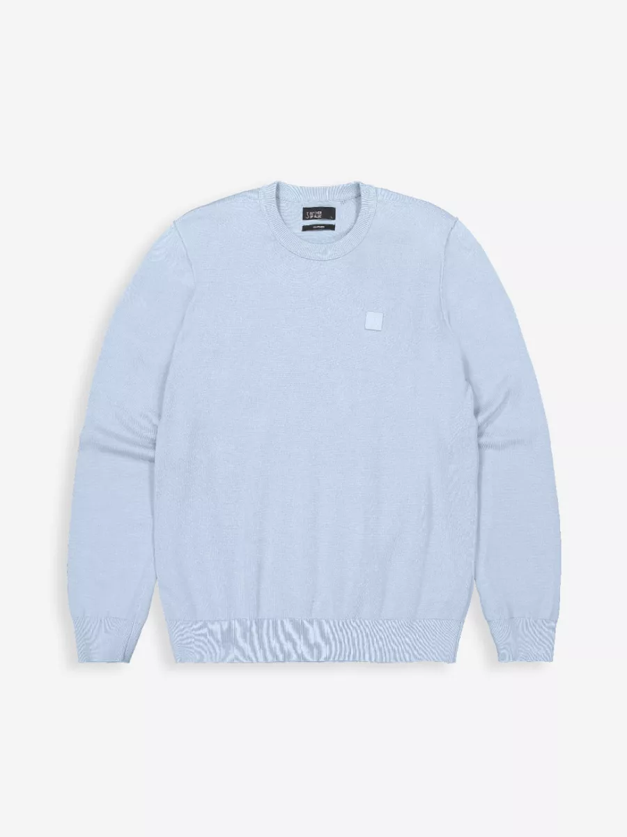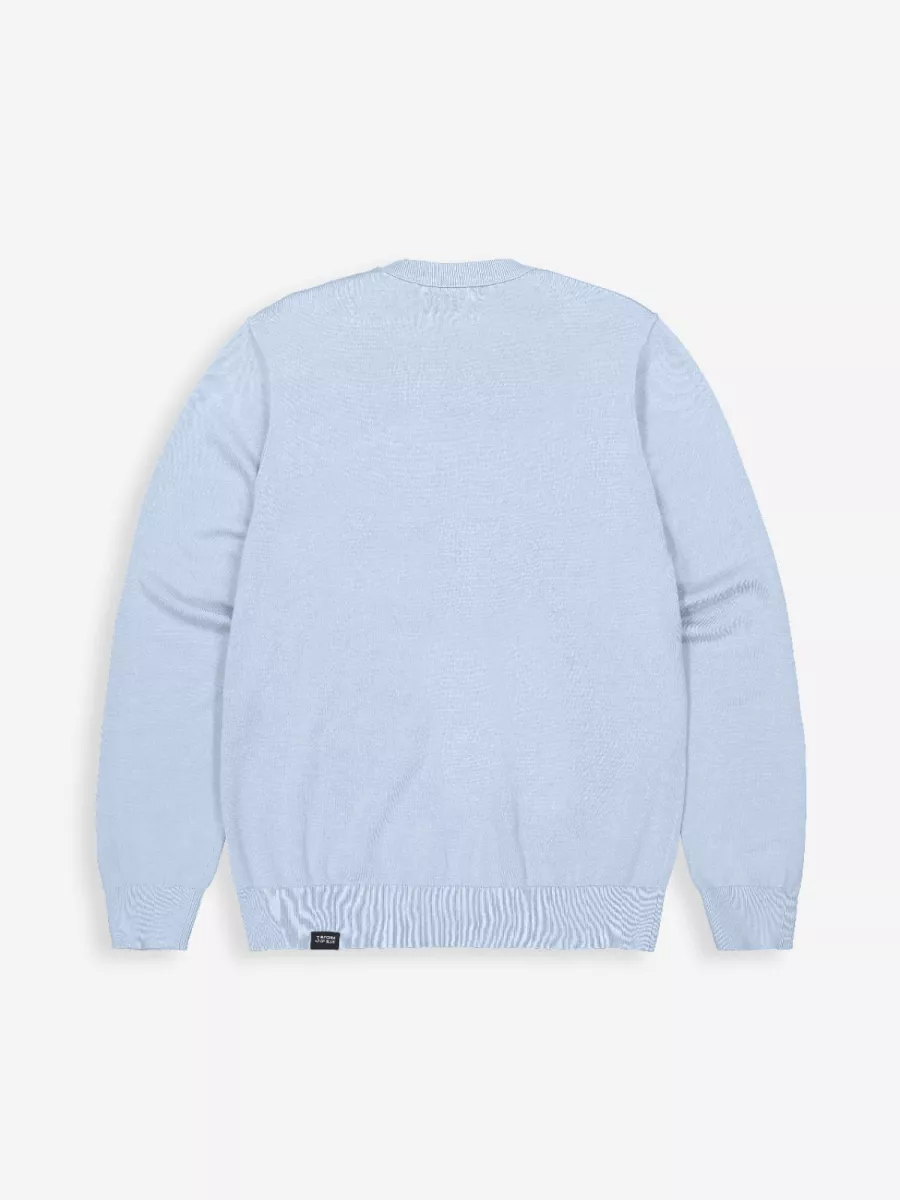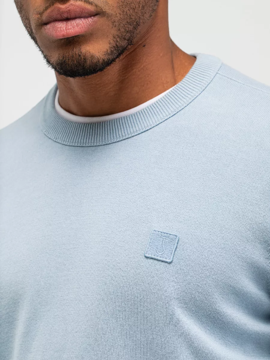• Lichtblauwe basistrui met fijn breisel