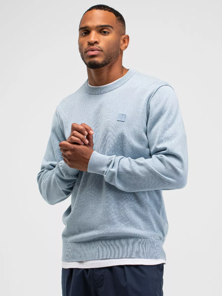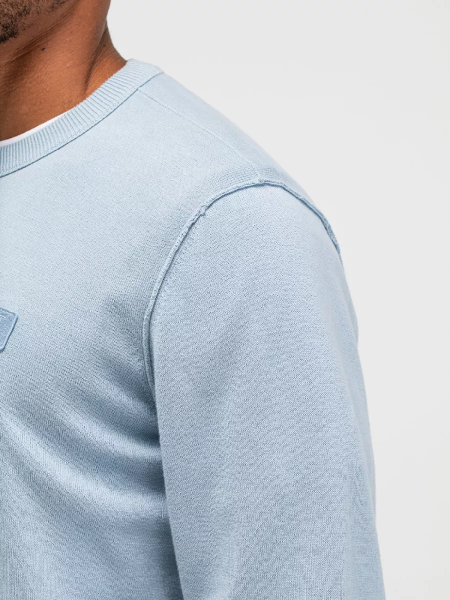 Deze lichtblauwe trui van Butcher of Blue heeft een frisse uitstraling door de zachte pastelkleur. Het Nederlandse merk staat bekend om kwalitatieve basics die gemaakt zijn om lang mee te gaan. De sweater heeft een ronde hals met geribbelde afwerking en hetzelfde detail vind je terug aan de manchetten en zoom. Op de borst zie je een klein vierkant logo in dezelfde kleur als de trui. Het fijne breisel zorgt voor een glad oppervlak en een verzorgde uitstraling. Je draagt deze trui over een shirt voor een nette casual look of gewoon als basislaag. Het biologisch katoen voelt prettig aan en is ademend, wat het kledingstuk geschikt maakt voor verschillende seizoenen.