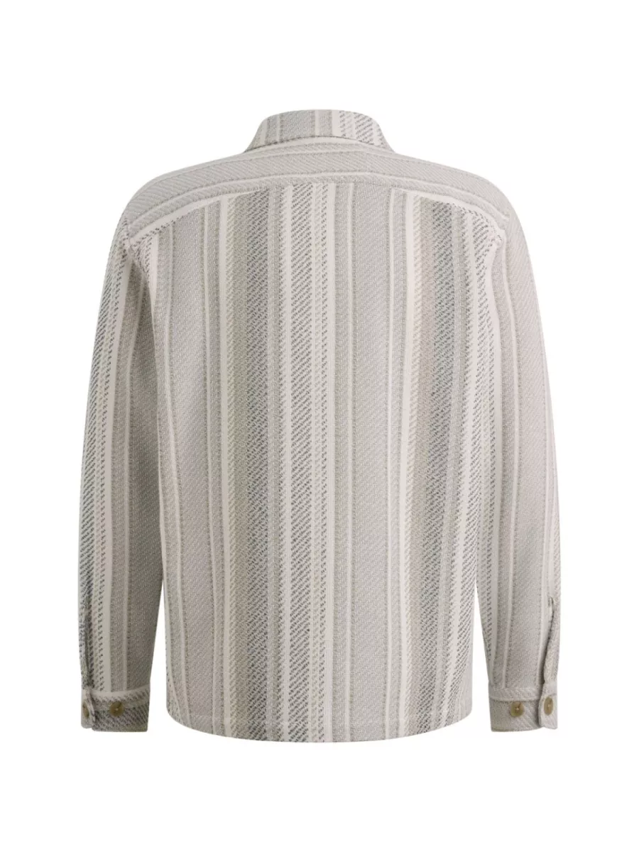 Een opvallende overshirt van Cast Iron met een rijkelijk gestreept jacquardweefsel in crème, wit, beige en donkergrijze tinten. Model CSI2603225 heeft een relaxed pasvorm met lange mouwen en een klassieke kraag. Het weefsel heeft brede verticale strepen in wisselende breedtes met een diagonale structuur in elke baan, wat het geheel een complex, artisanaal karakter geeft. De knopsluiting met bruine knopen loopt door tot onder. De manchetten zijn afgewerkt met een kleine Cast Iron sierknoop. De katoenen stof heeft een stevige, geweven kwaliteit die het stuk meer een licht jackmodel geeft dan een overshirt. Draag hem open over een effen T-shirt of polo, of dicht als apart stuk.