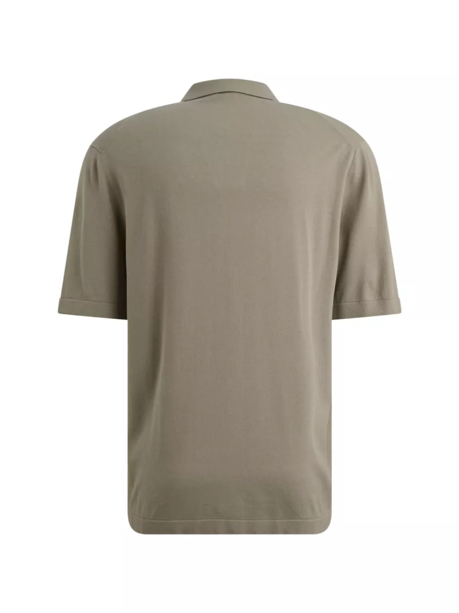 Een polo van Cast Iron in een gedempte olijfgrijs tint met een open Italiaanse kraag zonder knopen en een relaxed pasvorm. Model CPSS2603854 heeft korte mouwen en een brede, platte kraag die open valt, wat het shirt een ontspannen, nonchalante uitstraling geeft. De stof heeft een fijn piqué structuurweefsel dat de olijfgrijze kleur extra diepte geeft. Op de mouw bevindt zich een klein zwart drukknoop-detail. De stof van gerecycled viscose en polyester is soepel en licht, met een aangename draperingskwaliteit. De relaxed pasvorm is iets losser dan een klassieke polo, wat het shirt comfortabel draagt bij warmere temperaturen. Combineer hem met een beige chino of een donkerdere jeans.