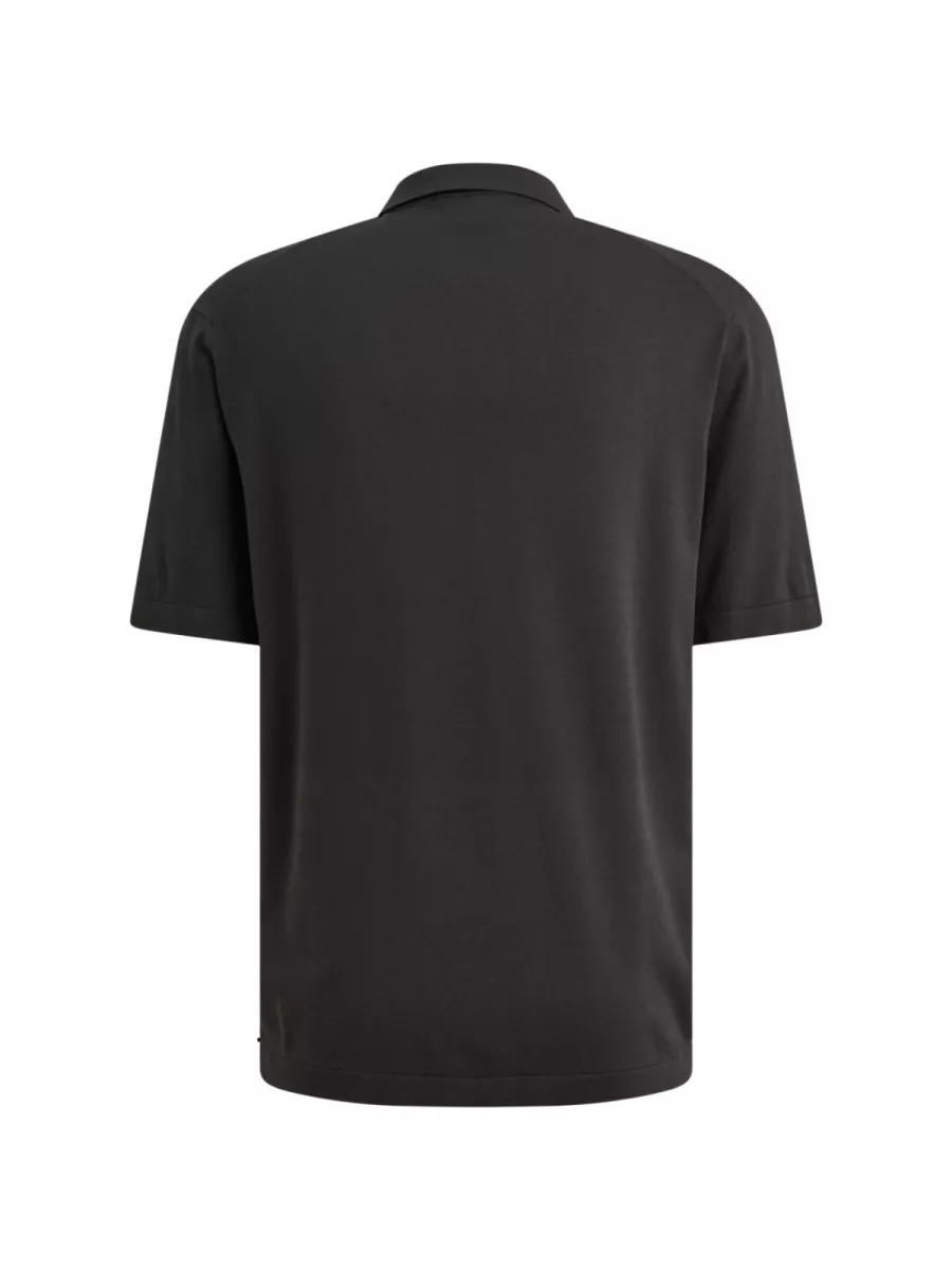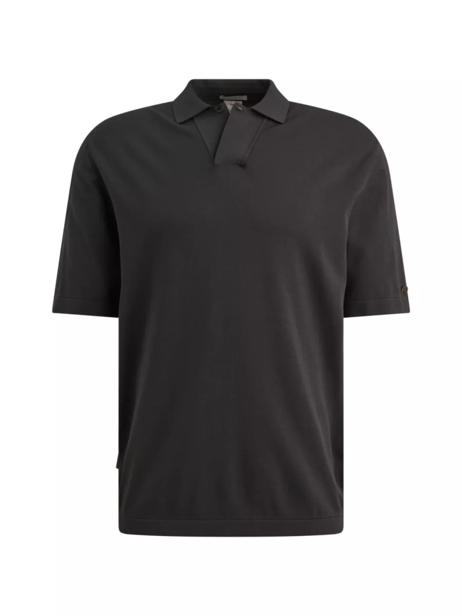 Een polo van Cast Iron in een diep antraciet-zwart met een open Italiaanse kraag zonder knopen en een relaxed pasvorm. Model CPSS2603854 heeft korte mouwen en een brede, platte kraag die open valt, wat het shirt een ontspannen maar geklede uitstraling geeft. De stof heeft een fijn piqué structuurweefsel dat de donkere kleur diepte geeft. Op de mouw bevindt zich een klein terracotta logo-badge die een warm kleuraccent vormt tegen het donkere shirt. De stof van gerecycled viscose en polyester is soepel en licht, met een aangename draperingskwaliteit. De relaxed pasvorm draagt comfortabel en werkt zowel in een casual als een smart casual context. Combineer hem met een beige of witte broek voor een sterk kleurcontrast.