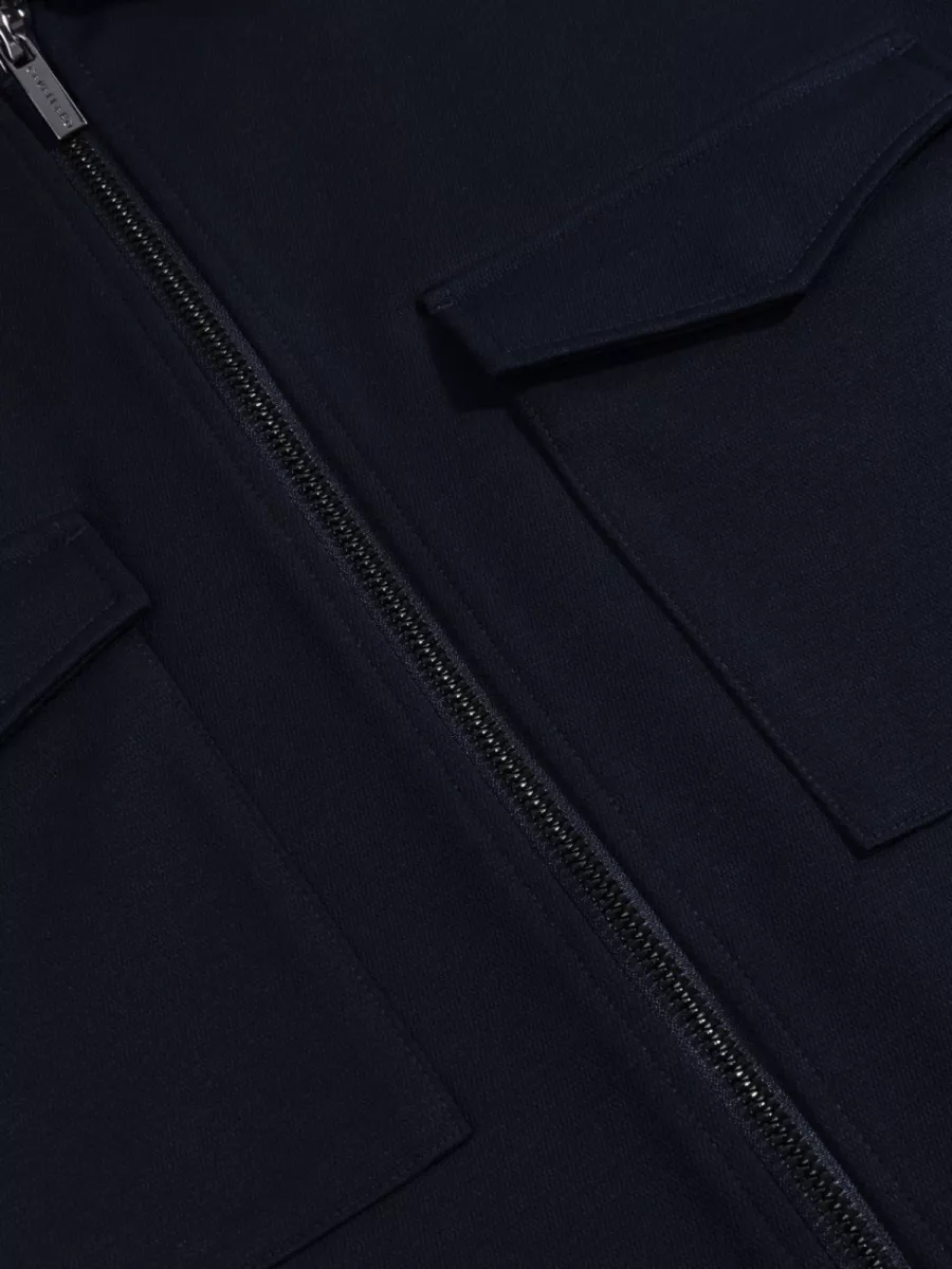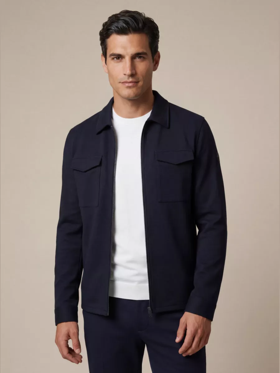 Deze overshirt van Cavallaro is uitgevoerd in een donkerblauwe kleur met een soepele, licht gestrekte stof. De doorgaande rits en twee borstzakken met klepje geven hem een functioneel en modern karakter. De blending van polyester met bamboe en elastaan is praktisch: bamboe draagt bij aan een ademend en temperatuurregulerende werking, terwijl de elastaan zorgt voor bewegingsvrijheid en een goede pasvorm. De donkere kleur maakt hem makkelijk te combineren met uiteenlopende outfits en geschikt voor iets formelere gelegenheden dan de beige variant. Draag hem open als lichte jas of gesloten over een T-shirt of dunne polo.