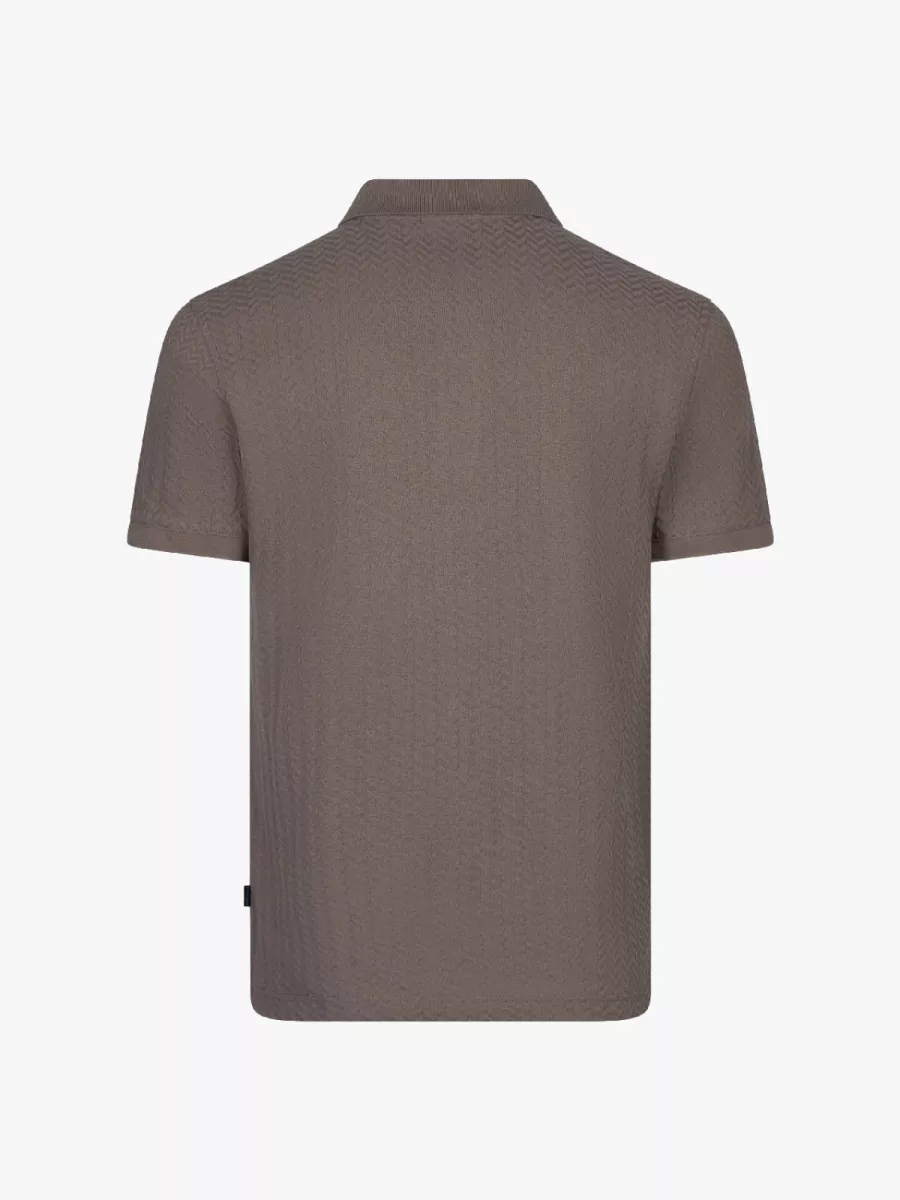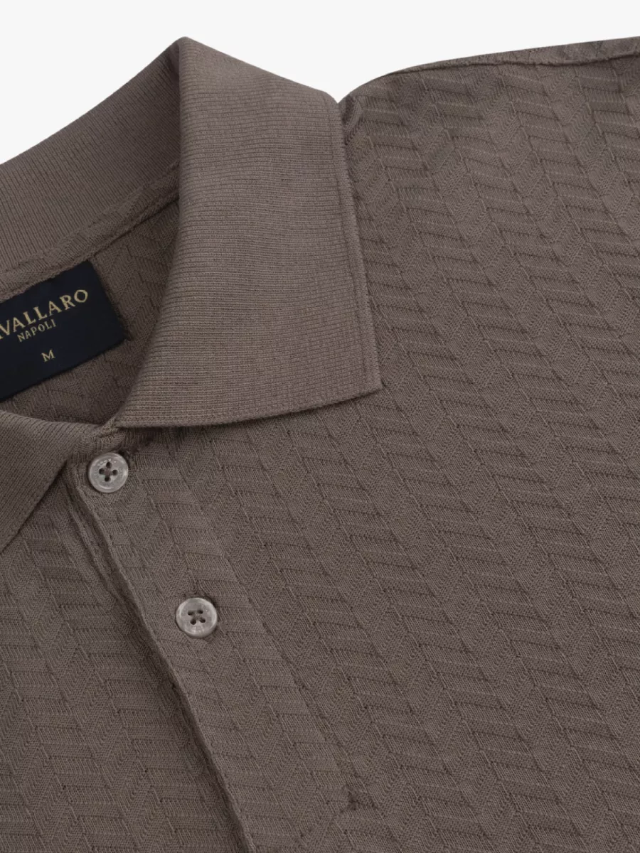 Deze taupe polo van Cavallaro heeft een fijn reliëfpatroon met een zigzagstructuur die het shirt een luxe uitstraling geeft. Cavallaro richt zich op mannen die op zoek zijn naar verfijnde kledingstukken met Italiaanse invloeden. De polo heeft een klassieke kraag en een korte knoopsluiting. Het gestructureerde patroon loopt over het hele shirt en geeft het een interessante textuur. De korte mouwen zijn afgewerkt met geribbelde boorden. Deze polo draag je bij casual gelegenheden of tijdens informele bijeenkomsten. De taupe kleur is neutraal en gemakkelijk te combineren met verschillende broeken. Het katoen zorgt voor draagcomfort en heeft voldoende ademend vermogen voor de zomermaanden.