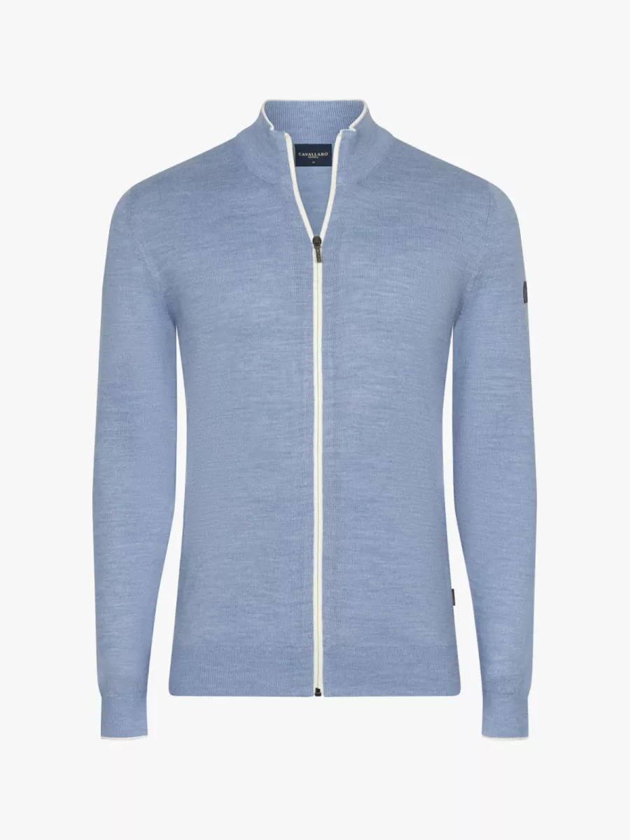 Dit vest van Cavallaro heeft een doorgaande rits en een opstaande kraag met een contrasterende witte bies aan de binnenzijde, wat hem een sportief-elegante uitstraling geeft. De lichtblauwe kleur maakt het een frisse keuze die goed combineert met zowel casual als smart casual outfits. De mix van wol en acryl zorgt voor een warm draaggevoel zonder dat het vest te zwaar wordt. Het fijn gebreide materiaal heeft een mooie structuur en een soepele val. Een veelzijdig stuk dat je kunt dragen op zichzelf over een overhemd of T-shirt, of als tussenlaag onder een jas.