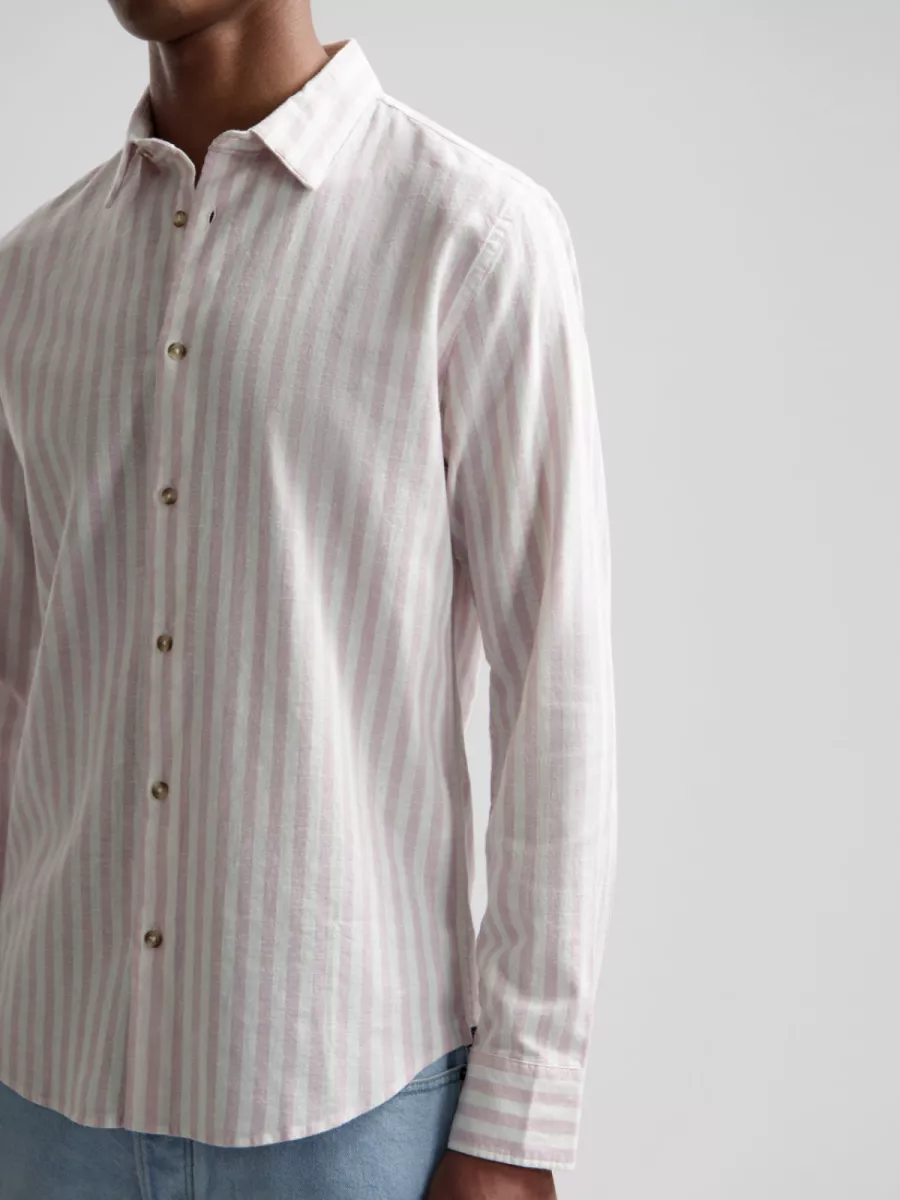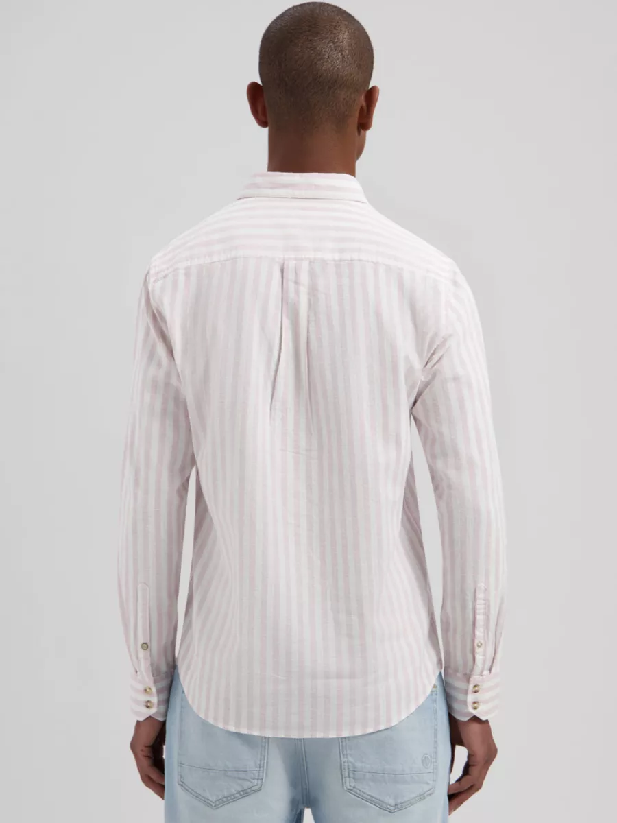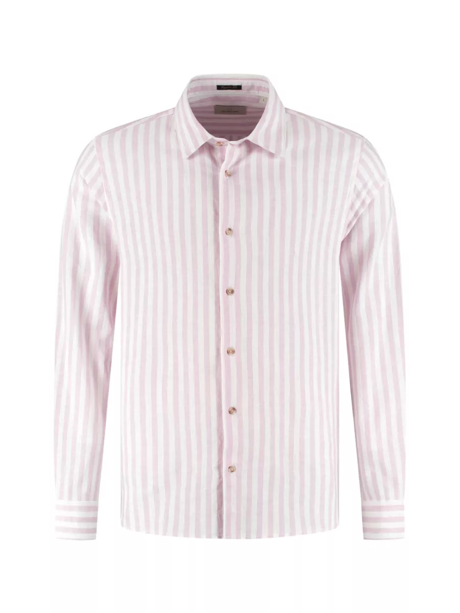 Dit korte mouwen overhemd van Dstrezzed heeft een verticaal breed streeppatroon in roze en wit op een katoen-linnen stof. De brede strepen geven het overhemd een zomers, fris karakter. De manchetten tonen een contrasterend dwarspatroon dat haaks op het lijfstuk staat, wat zorgt voor een speels afwerkingsdetail. De reverskraag en knoopsluiting geven hem een ontspannen look. De katoen-linnen samenstelling is luchtig en ademt goed, wat het overhemd prettig maakt op warme dagen. Draag hem losjes boven een effen witte of beige broek voor een frisse zomerlook.