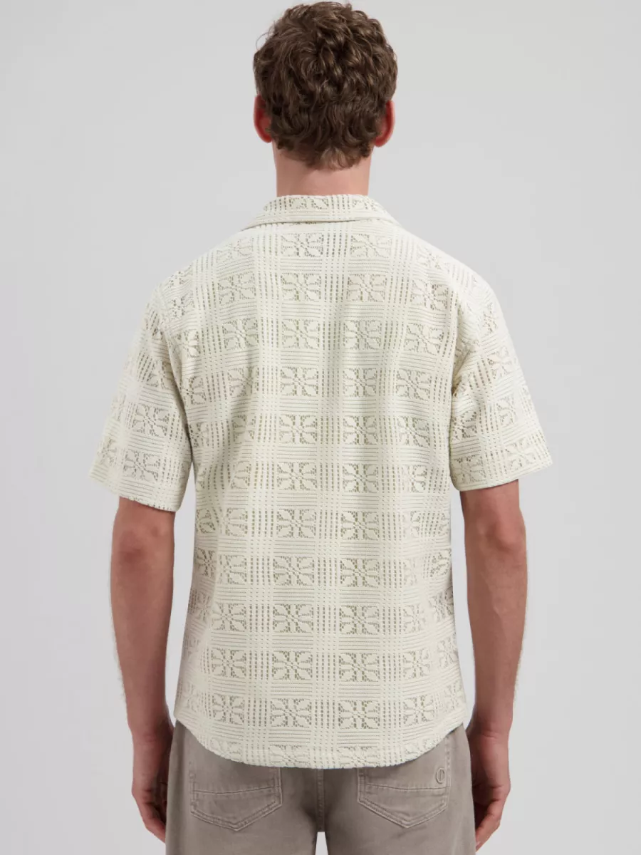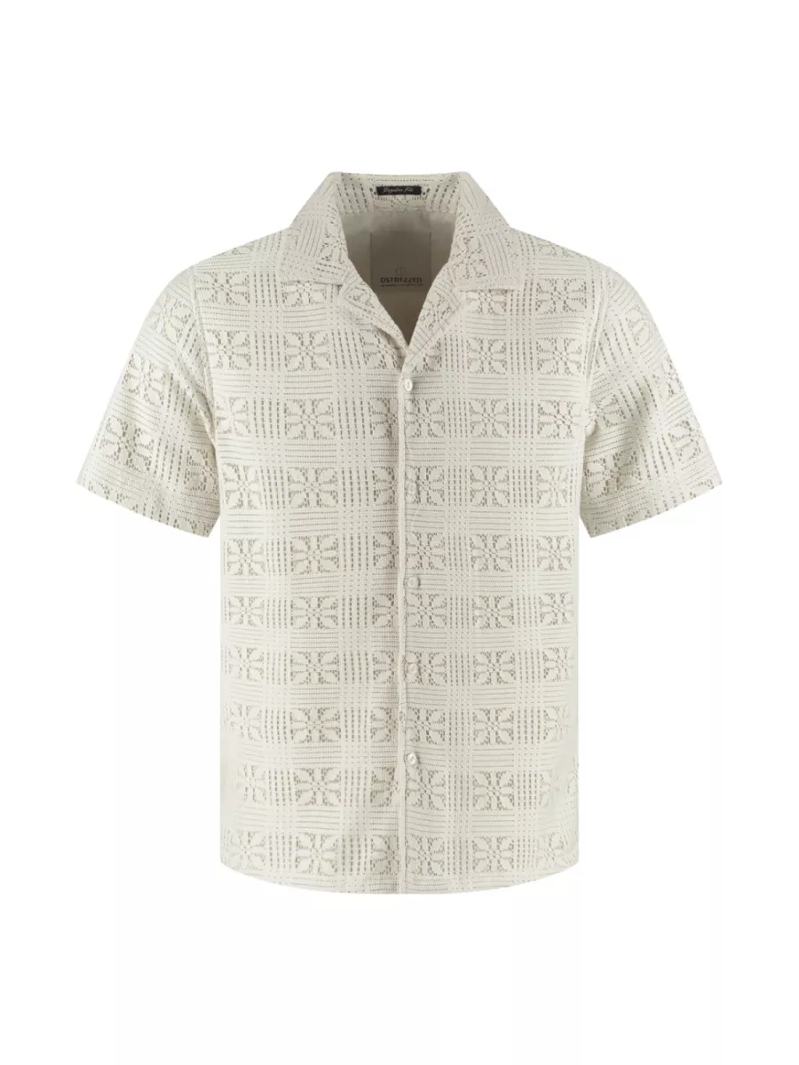 Dit korte mouwen vest van Dstrezzed heeft een gebroken witte kleur en is opgebouwd uit een open haakwerk met een geometrisch patroon van herhalende bloemmotieven in vierkante vakken. De open weving geeft het vest een luchtig, zomers karakter dat doet denken aan traditioneel haakwerk maar dan in een moderne herenmode toepassing. De Cubaanse kraag en knoopsluiting geven hem een nette afwerking. Draag hem over een T-shirt of lichte polo voor een complete zomerlook met een uitgesproken textuureffect.