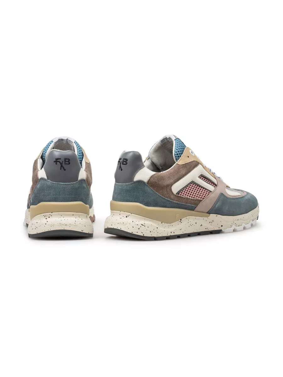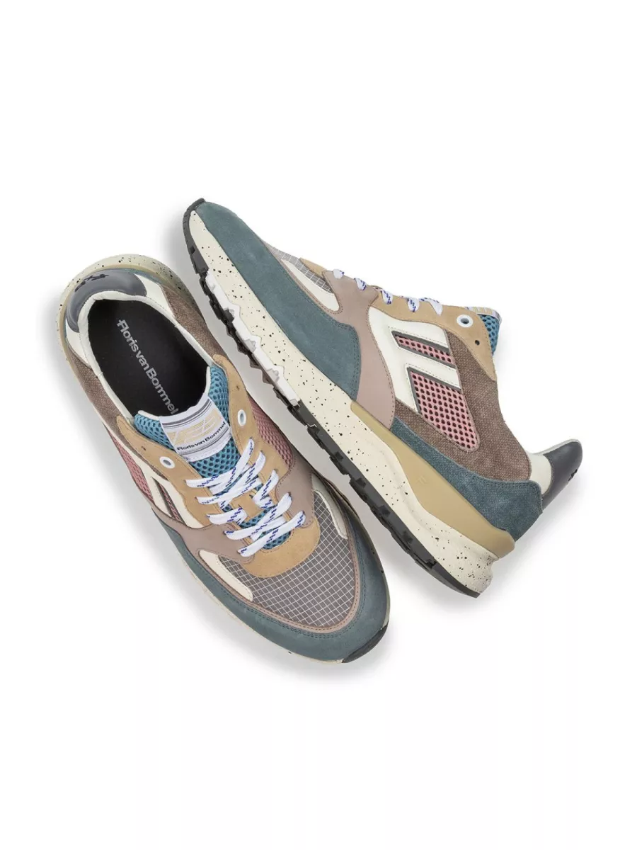 Deze multicolor retro-runner van Floris van Bommel springt in het oog door zijn bijzondere kleurencombinatie van stofblauw suède, roze mesh, taupe, camel en crèmewit. De gespikkelde witte middenzool met zwarte buitenzool versterkt het speelse, outdoorgeïnspireerde karakter. Witte veters met blauwe print, blauwe ogen en een geruite neus maken dit een opvallend uitgewerkt model. De naam “Floris van Bommel” is verwerkt op de tong en de zijkant. Een sneaker voor wie niet bang is voor kleur en detail.