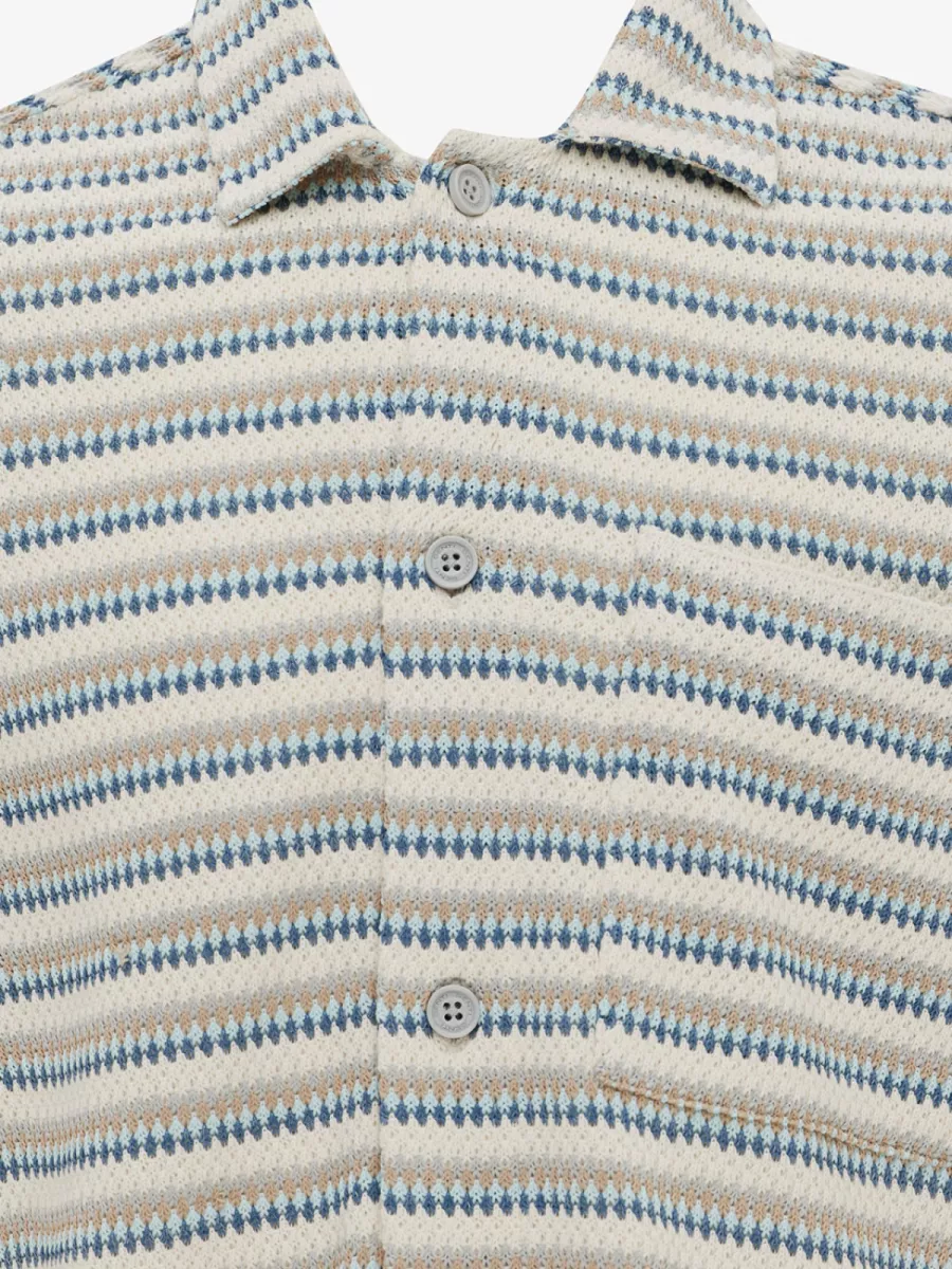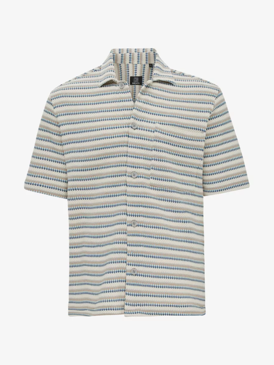 Dit korte mouw overhemd van Genti heeft een opvallend all-over dessin met horizontale strepen opgebouwd uit kleine ruitjes in beige, blauw en taupe. De open camp collar en doorgaande knoopsluiting geven het shirt een relaxte, vakantie-achtige uitstraling. Het borstzakje links voegt een functioneel detail toe. De rechte relaxte pasvorm valt losjes over de broek en is daarmee ideaal als zomeroverhemd. Combineert goed met een effen beige of navy short. Gemaakt van 60% polyester en 40% katoen.
