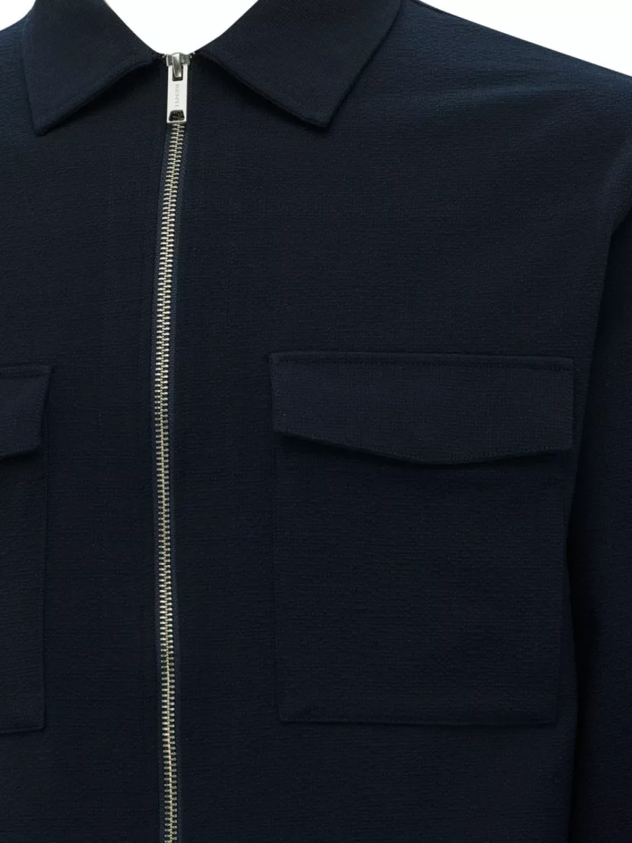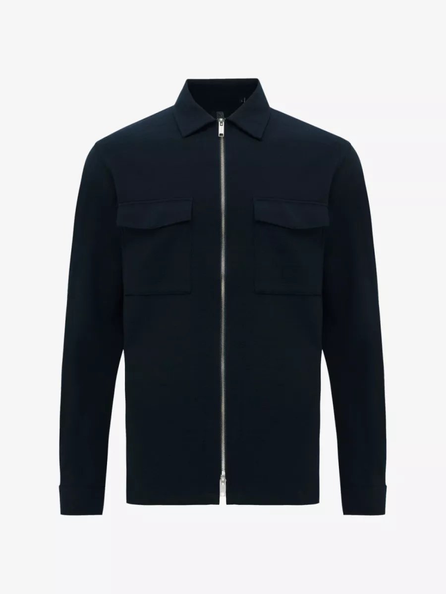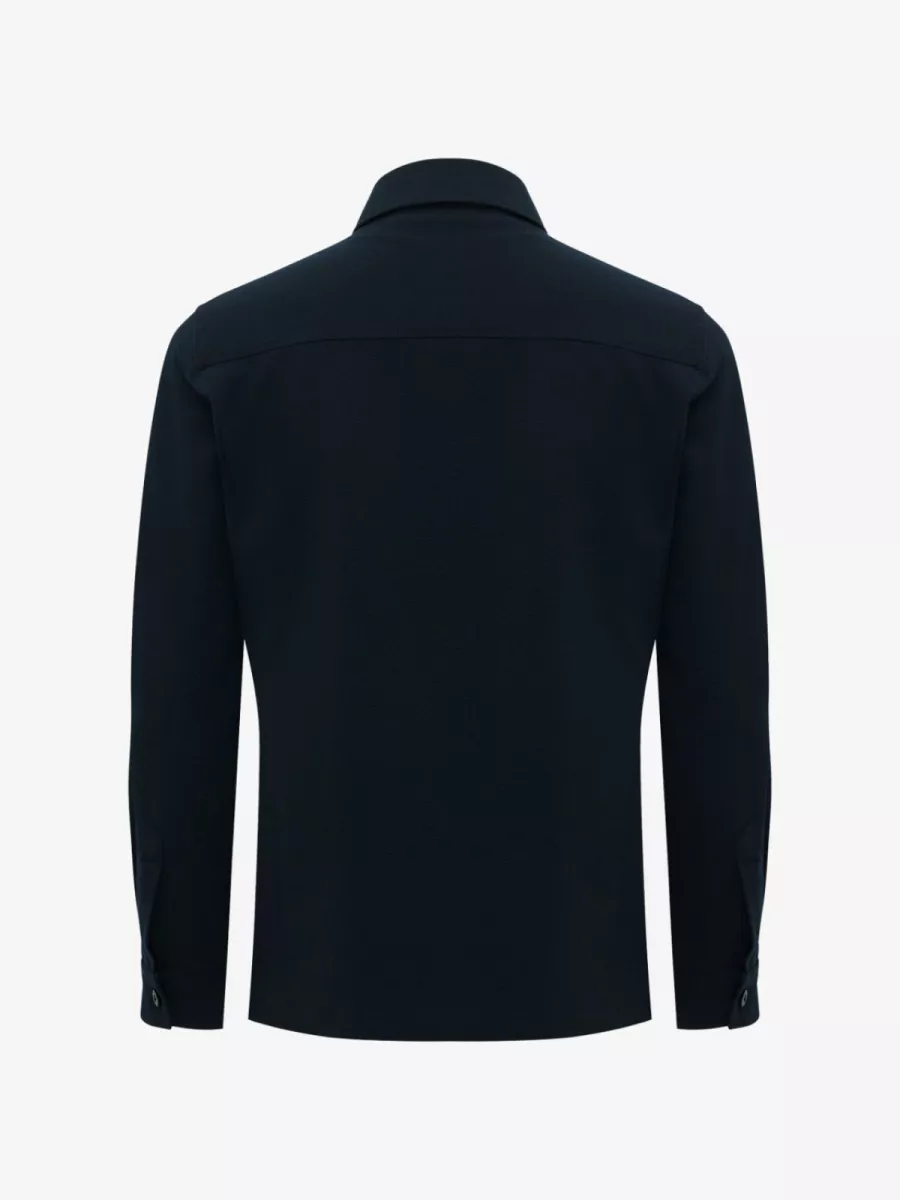 Deze donkerblauwe overshirt van Genti heeft een strakke, militair geïnspireerde vormgeving met twee grote borstzakken en een doorgaande rits met zilveren trekker. De klassieke spreidkraag en rechte snit geven het shirt een nette, gestructureerde uitstraling. Het seersucker-achtige materiaal zorgt voor een lichte textuur en goede luchtigheid. Als overshirt is hij veelzijdig inzetbaar: open over een t-shirt of gesloten als licht jasje. Donkerblauw combineert uitstekend met grijs, wit of een lichte jeans. Gemaakt van 70% polyester, 28% viscose en 2% elastaan.