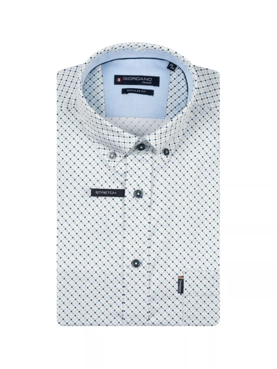 Dit regular fit overhemd van Giordano heeft een wit basisvlak met een fijn geometrisch allover print van stippen en diagonale streepjes in tinten van navy, blauw en grijs. Het patroon is opgebouwd uit meerdere kleine herhalende elementen die samen een samenhangend geheel vormen. De button-down kraag en donkere knoopsluiting geven hem een nette uitstraling. De stretch-eigenschap van de stof zorgt voor extra bewegingsvrijheid. Combineer hem met een effen donkere of kaki broek voor een verzorgde dagelijkse look.