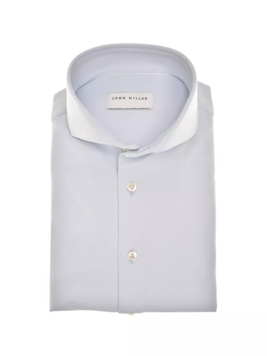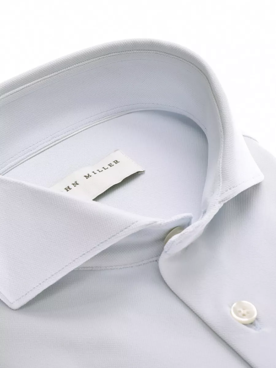 Dit slim fit overhemd van John Miller is uitgevoerd in een lichtblauwe kleur met een fijne piqué structuur die de stof een subtiele textuur geeft. De haaikraag en parelmoerkleurige knoopsluiting geven hem een nette, klassieke afwerking die past bij de lichte kleur van het overhemd. De polyamide-elastaan samenstelling zorgt voor een soepele val, goede kreukweerstand en prettige bewegingsvrijheid, wat dit overhemd geschikt maakt voor een lange werkdag. Combineer hem met een donkere broek of pak voor een strakke zakelijke look.