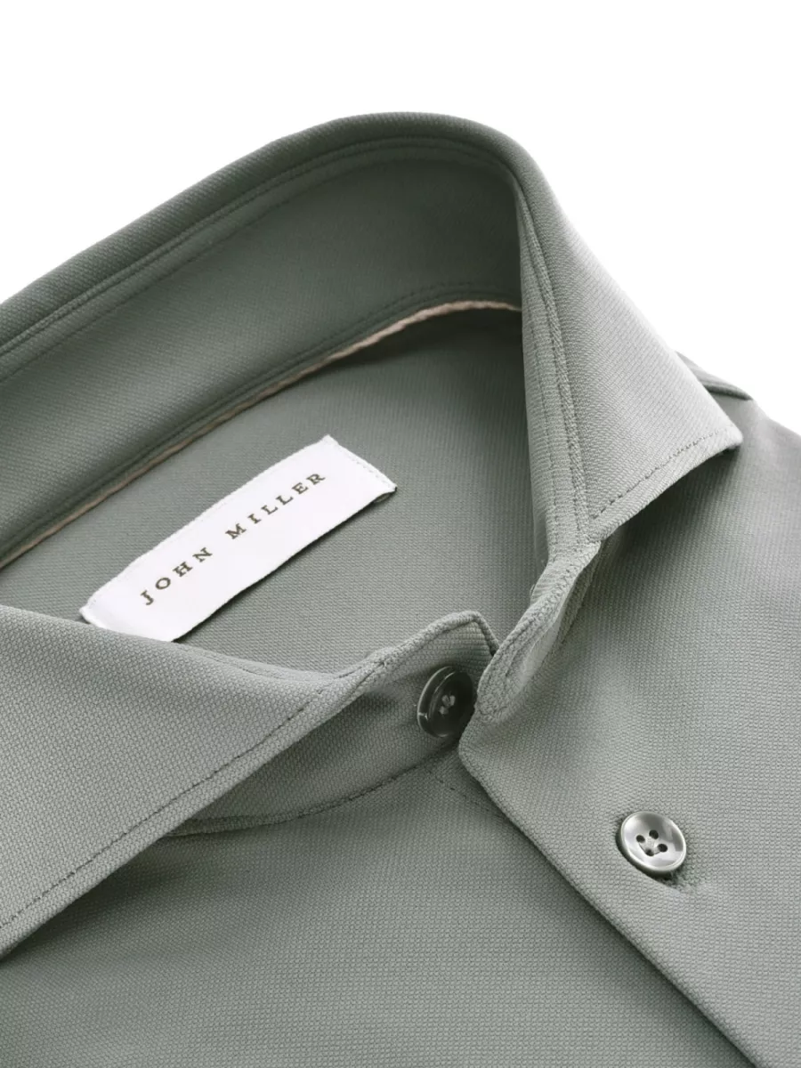 Dit slim fit overhemd van John Miller is uitgevoerd in een warme taupe-grijze kleur met een fijne piqué structuur. De haaikraag heeft een iets lichtere binnenzijde als subtiel contrastdetail, afgewerkt met een fijne donkere bies. De bijpassende knoopsluiting sluit goed aan bij het aardse kleurenpalet. De polyamide-elastaan samenstelling zorgt voor een soepele val, goede kreukweerstand en prettige bewegingsvrijheid. De taupe-grijze kleur is breed inzetbaar en combineert goed met bruin, beige en donkerblauw voor een verzorgde werkoutfit.