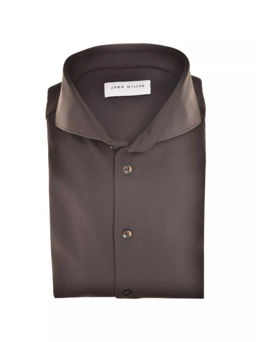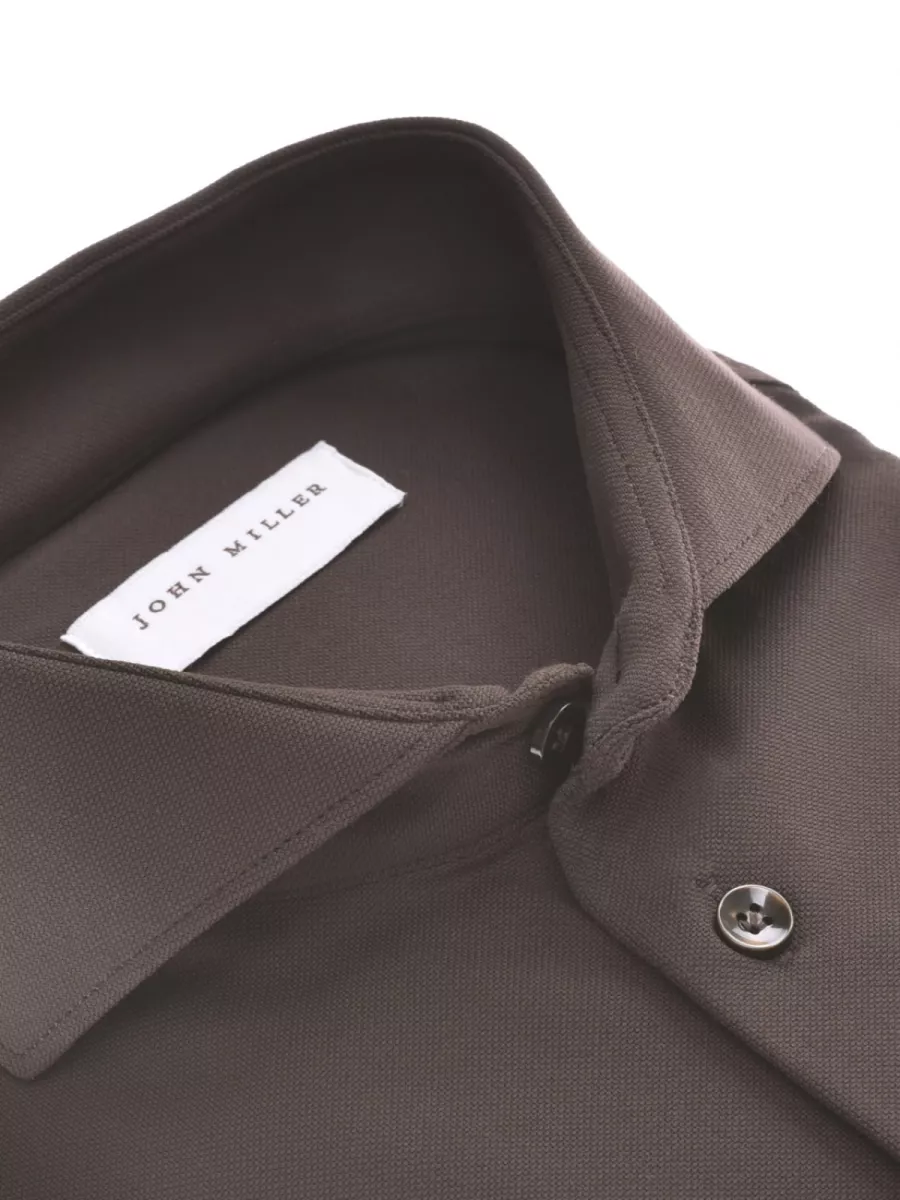Dit slim fit overhemd van John Miller is uitgevoerd in een donkerbruine kleur met een fijne piqué structuur. De haaikraag heeft een iets lichtere binnenzijde als subtiel contrastdetail. De donkere knoopsluiting sluit naadloos aan bij de diepe bruine tint. De polyamide-elastaan samenstelling zorgt voor een soepele val, goede kreukweerstand en prettige bewegingsvrijheid. De donkerbruine kleur geeft het overhemd een warme, krachtige uitstraling en combineert goed met beige, kaki of donkergrijze broeken.