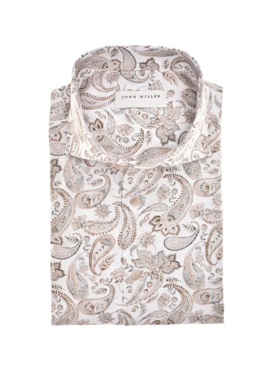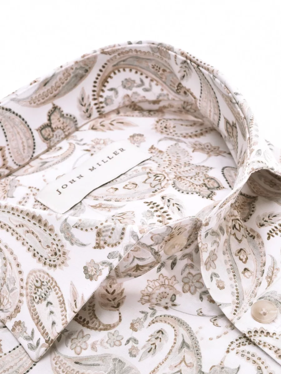 Dit slim fit overhemd van John Miller heeft een wit basisvlak met een uitgesproken paisleyprint in tinten van beige, bruin, grijs en zacht roze. De grote slingerende paisleymotieven worden afgewisseld met kleine bloem- en bladdetails, wat het geheel een klassiek maar levendig karakter geeft. De haaikraag en gebroken witte knoopsluiting geven het overhemd een nette afwerking die past bij de warme kleurstelling van het print. De katoenen stof draagt luchtig en comfortabel. Draag hem met een effen broek in een neutrale kleur om het patroon de ruimte te geven.