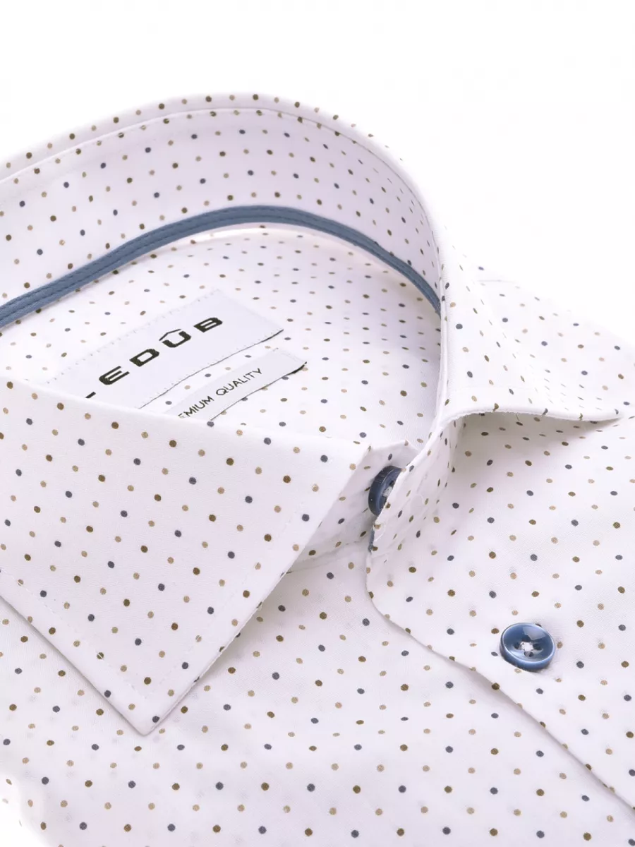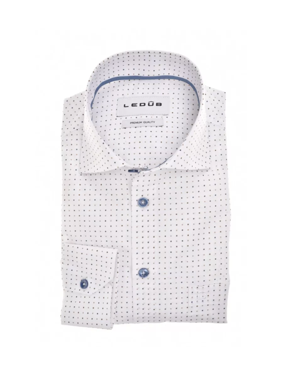 Dit modern fit overhemd van Ledub heeft een wit basisvlak met een fijn allover stippenprint in tinten van blauw, bruin en beige. De stippen zijn regelmatig verdeeld en geven het overhemd een speels maar verzorgd karakter. De haaikraag en blauwe knoopsluiting geven hem een nette uitstraling. Een kleine borstzak met Ledub-logo is een herkenbaar detail. De binnenzijde van de kraag is afgewerkt met een blauwe bies als stijlvol detail. De polyester-katoen samenstelling zorgt voor goede kreukweerstand en makkelijk onderhoud. Combineer hem met een blauwe of bruine broek voor een samenhangende look.