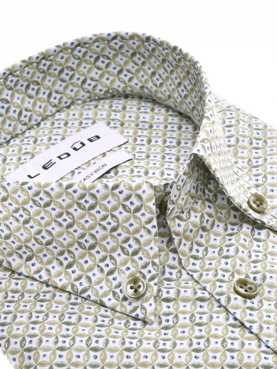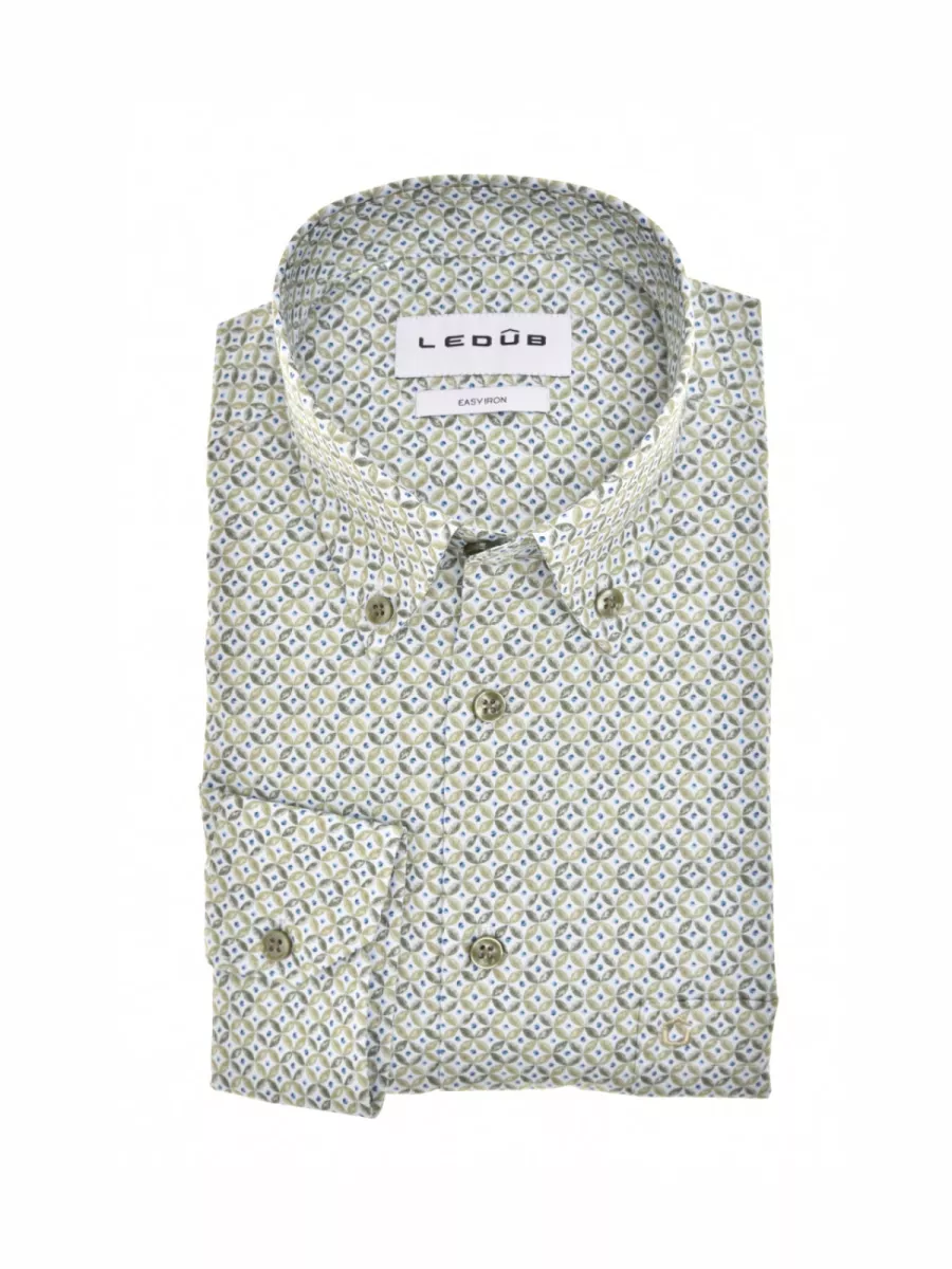 Dit modern fit overhemd van Ledub heeft een wit basisvlak met een fijn allover geometrisch print van overlappende cirkels in olijfgroene tinten, afgewisseld met kleine blauwe stipjes. Het patroon is regelmatig en gestructureerd, wat het overhemd een verzorgde uitstraling geeft. De button-down kraag en bijpassende knoopsluiting geven hem een nette, casual look. Een kleine borstzak met Ledub-logo is een herkenbaar detail. Dankzij de easy iron behandeling is dit overhemd makkelijk te onderhouden en heeft het na het wassen nauwelijks strijken nodig. Combineer hem met een donkere of kaki broek voor een frisse dagelijkse look.