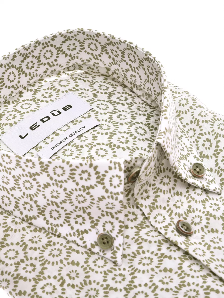 Dit modern fit overhemd van Ledub heeft een wit basisvlak met een allover print van ronde bloemmotieven opgebouwd uit kleine stipjes in olijfgroen. De motieven zijn regelmatig verdeeld en geven het overhemd een speels maar verzorgd karakter. De haaikraag en bijpassende knoopsluiting geven hem een nette, ontspannen uitstraling. Een kleine borstzak met Ledub-logo is een herkenbaar detail. De stof van lyocell en linnen is van nature ademend en heeft een lichte, soepele val die prettig draagt op warmere dagen. Combineer hem met een effen kaki of beige broek voor een frisse zomerlook.