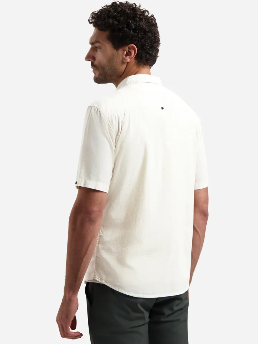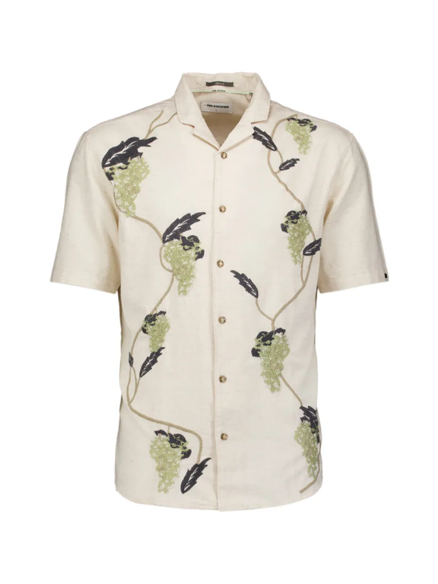 Dit korte mouwen overhemd heeft een gebroken witte basiskleur met een allover geborduurde print van druivenranken in olijfgroen en donkerblauw. De slingerende ranken met druiventrossen geven het overhemd een uitgesproken, handgemaakt karakter. De Cubaanse kraag en goudkleurige knoopsluiting sluiten goed aan bij het warme, organische karakter van de print. De losse pasvorm draagt comfortabel en luchtig. De samenstelling van 45% lyocell, 39% katoen en 16% linnen geeft de stof een soepele val met een lichte, ademende kwaliteit.