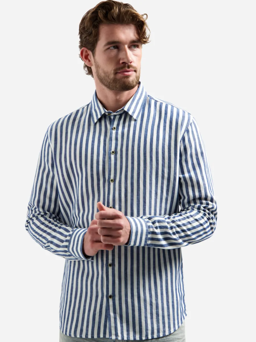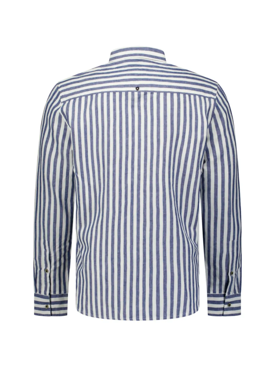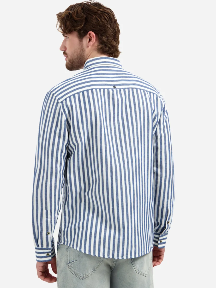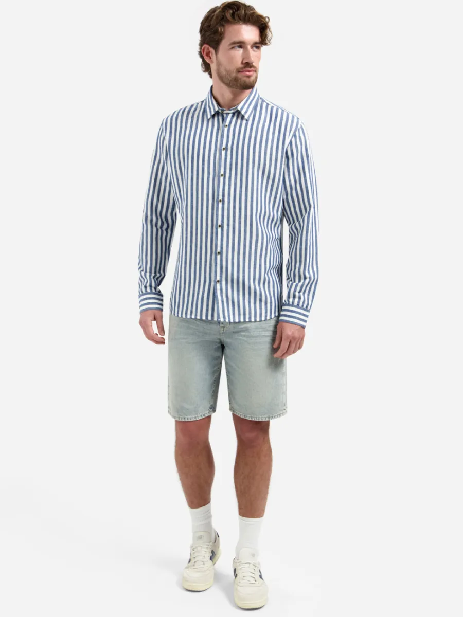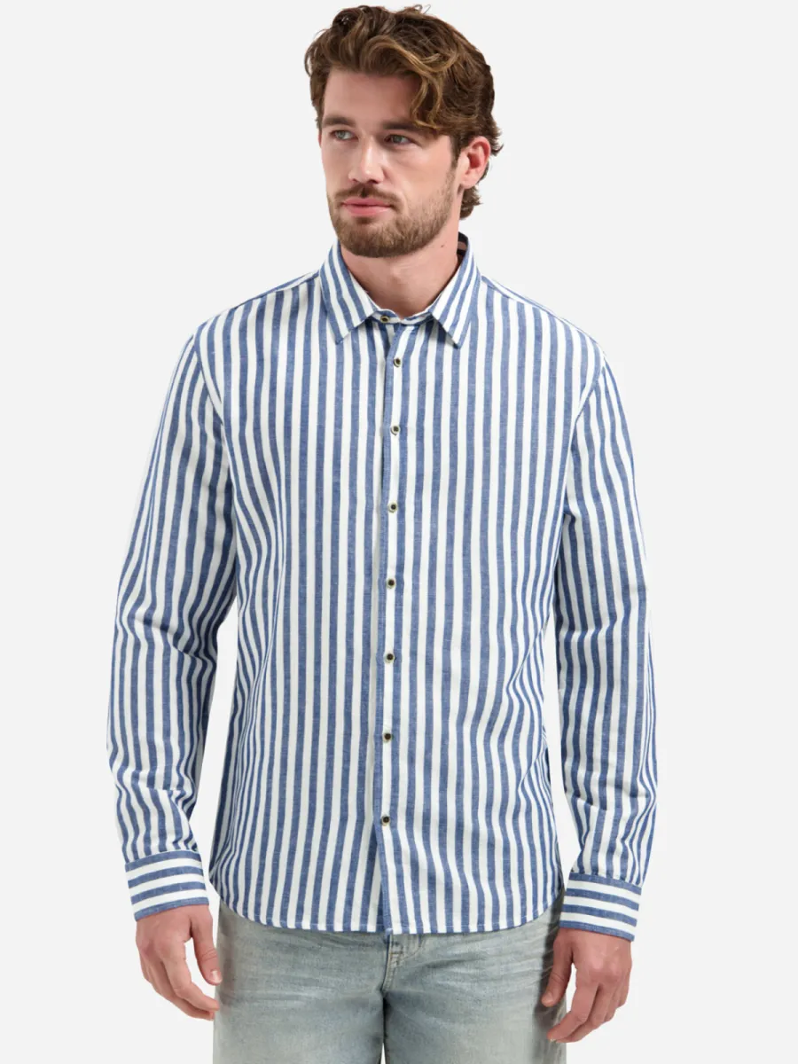 Dit overhemd heeft een blauw-wit gestreept patroon in brede, verticale strepen op een luchtige linnen-katoen stof. De strepen zijn helder en contrasteren goed, wat het overhemd een frisse, zomerse uitstraling geeft. De button-down kraag en donkere knoopsluiting geven hem een nette afwerking. De manchetten tonen een contrasterend dwarsstreeppatroon als fijn detail. De pasvorm is ontspannen met een rechte snit. De samenstelling van 52% linnen en 48% katoen zorgt voor een ademende, luchtige draagkwaliteit.