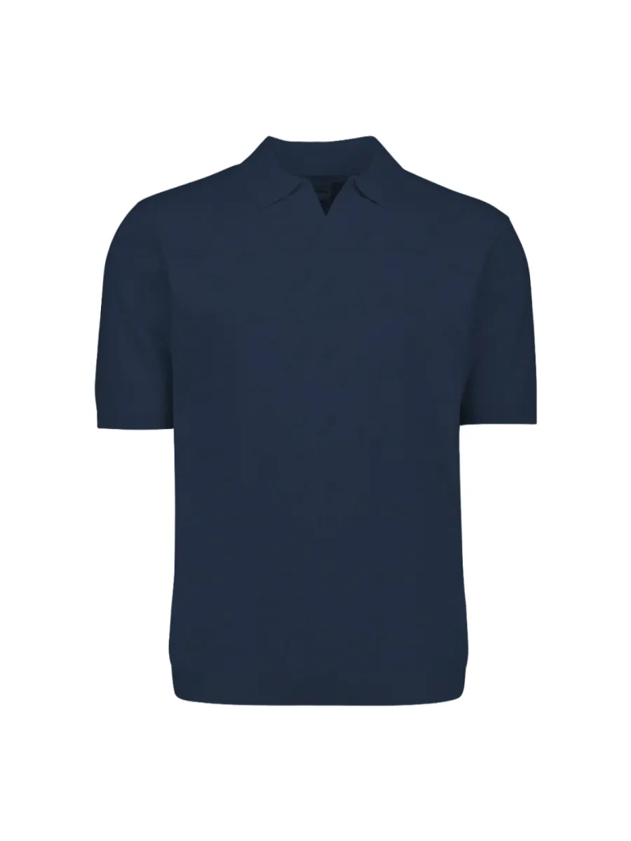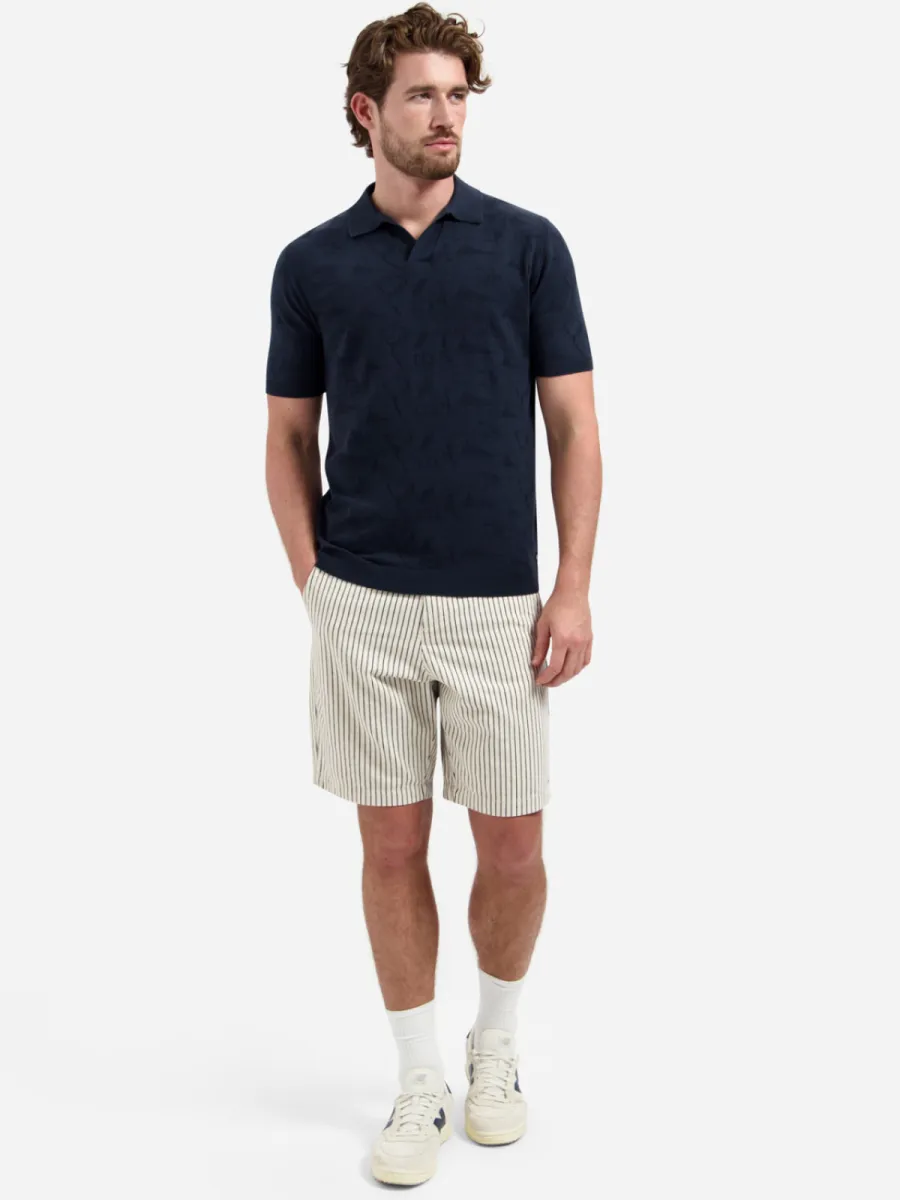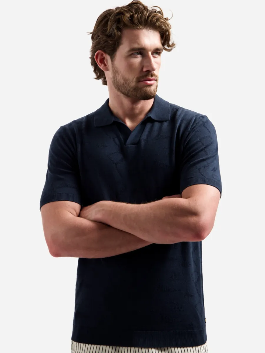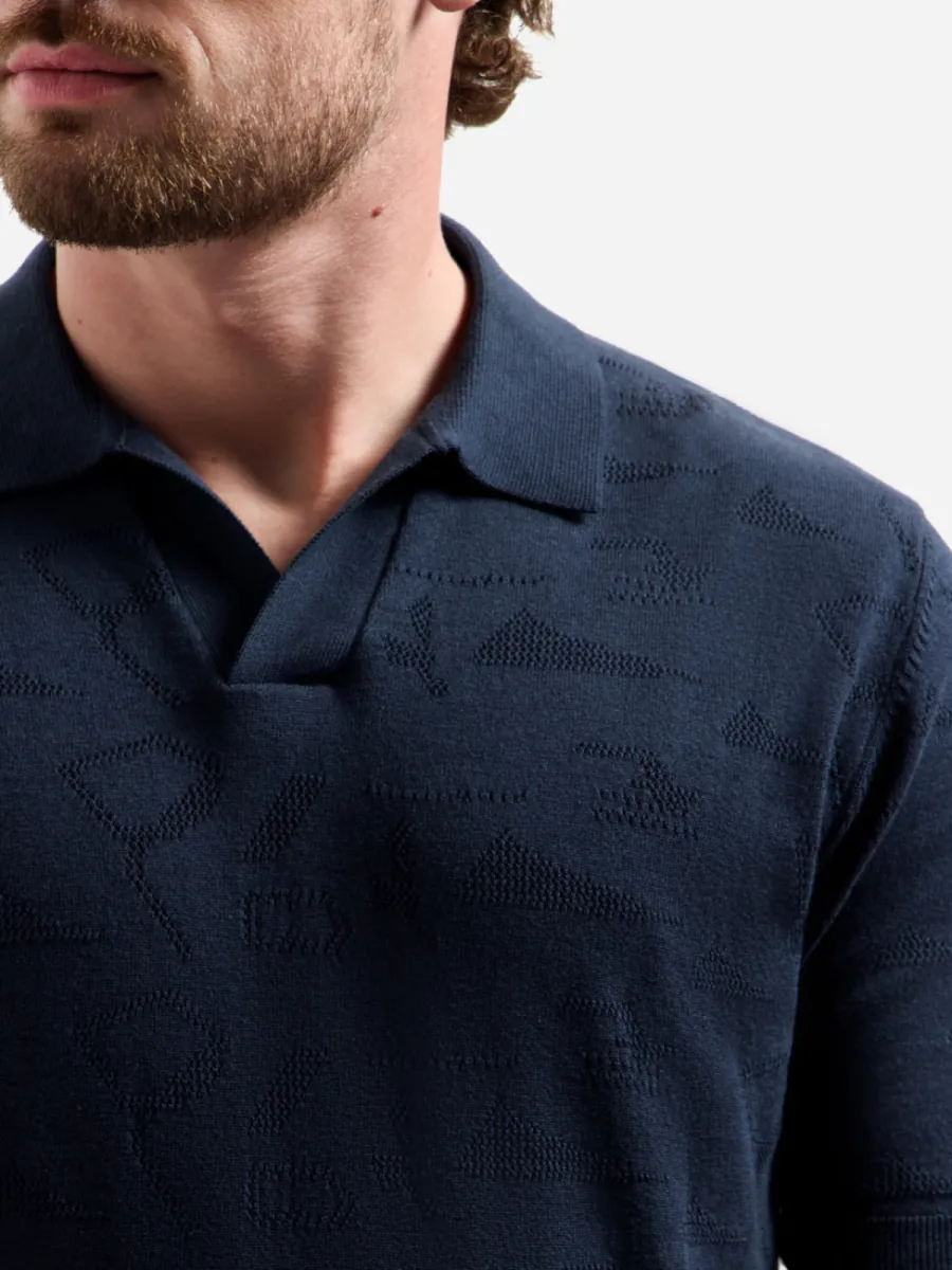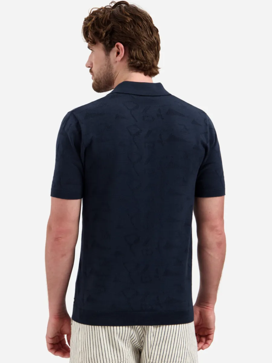 Deze donkerblauwe polo is vervaardigd in een fijn gebreide kwaliteit met een allover tonal jacquardpatroon van abstracte, organische vormen. Het patroon is subtiel en speelt met de structuur van het breiwerk, wat hem visueel interessant maakt zonder opvallend te zijn. De open polokraag zonder knoopsluiting geeft hem een ontspannen, eigentijdse uitstraling. De geribbelde manchetten en zoom zorgen voor een nette afwerking. De reguliere pasvorm met korte mouwen draagt comfortabel en is goed combineerbaar met zowel een chino als een lichte jeans. De samenstelling van 66% katoen en 34% nylon geeft de stof een goede vormbehoud en soepele aanraking.