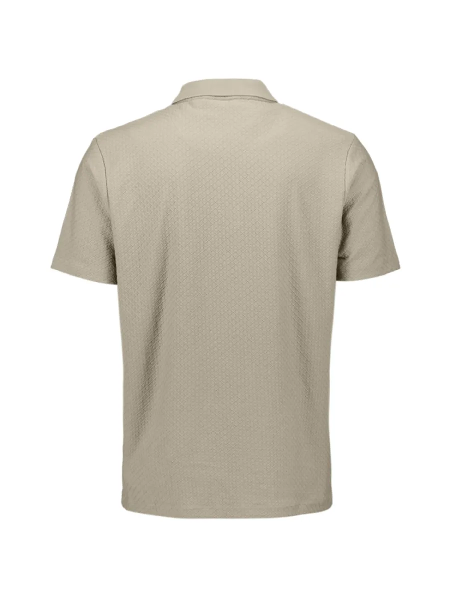 Deze polo heeft een gedempte taupe kleur en is vervaardigd in een licht gestructureerde stof met een tonal ruitjacquard patroon dat hem een subtiel textuurgericht karakter geeft. De polokraag met een korte rits als sluiting aan de voorkant geeft hem een eigentijdse uitstraling. De pasvorm is ontspannen met korte mouwen en een rechte snit. De neutrale taupe kleur combineert goed met zowel lichte als donkere broeken. De samenstelling van 52% katoen en 48% gerecycled polyester geeft de stof een goede draagkwaliteit.