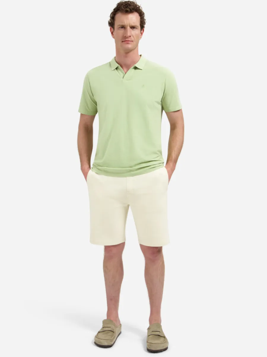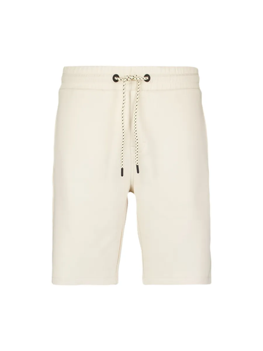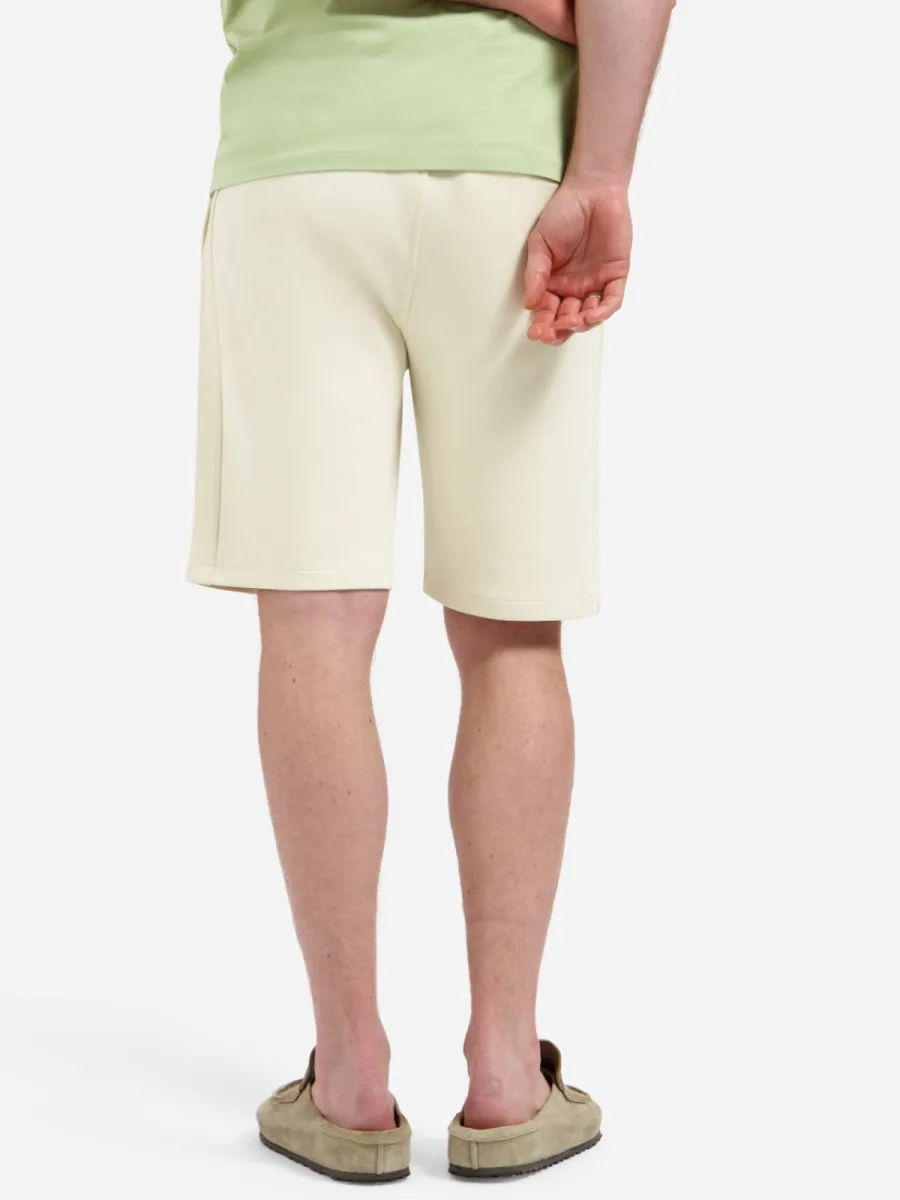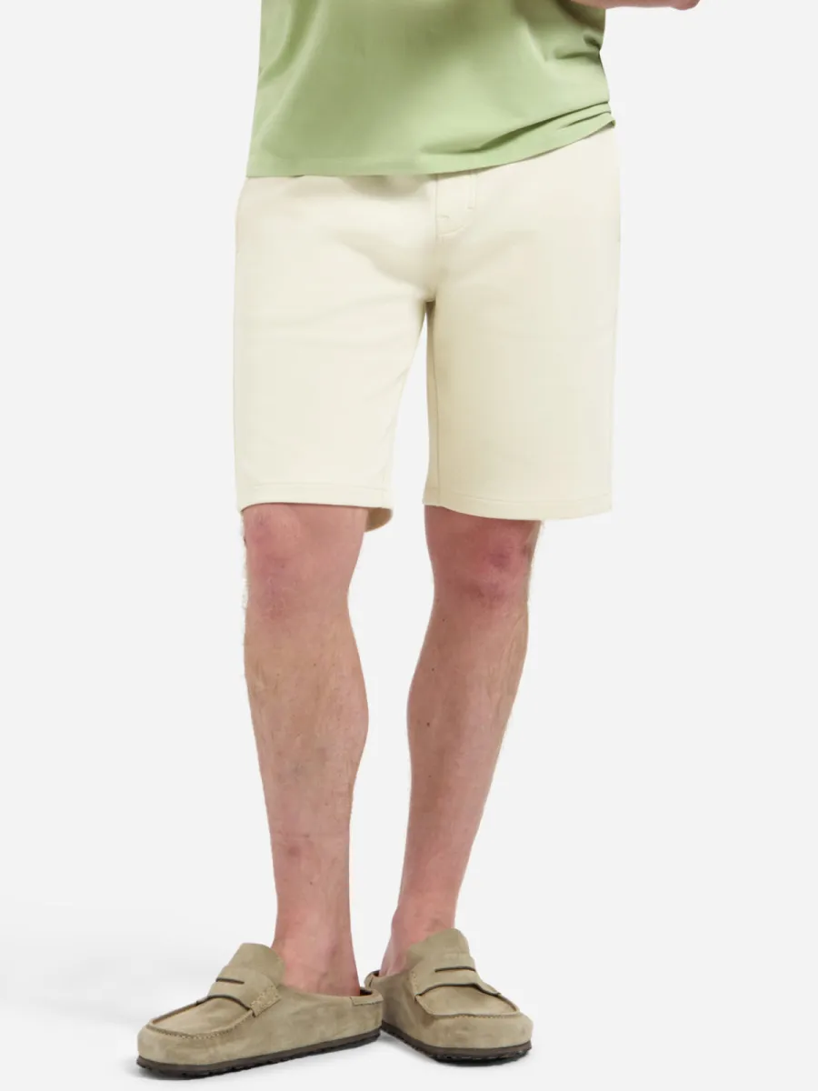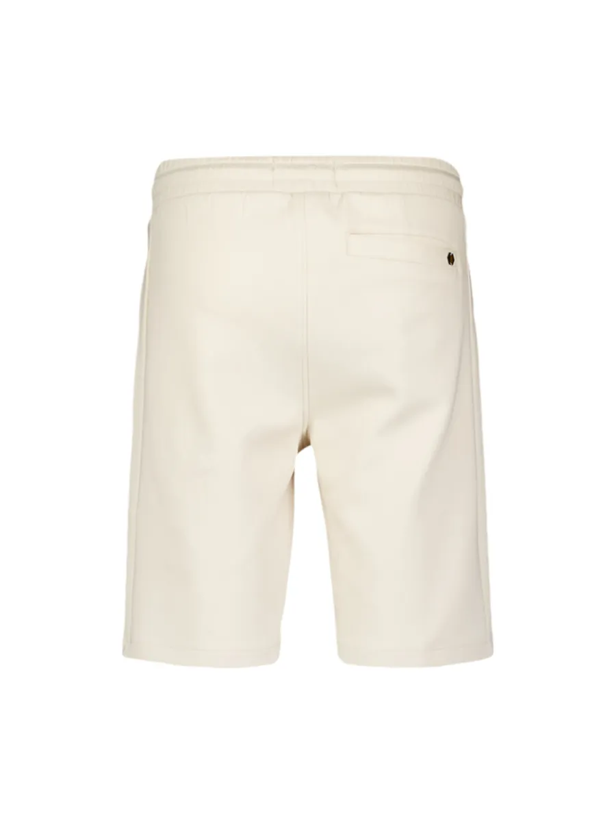 Deze short heeft een gebroken witte kleur en is vervaardigd in een zachte sweat-achtige stof. De elastische tailleband met een gevlochten koordtrekker en zwarte metalen ogen geeft hem een sportief, verzorgd karakter. De pasvorm is ontspannen met een iets langere pijplengte. De neutrale ecru kleur combineert goed met vrijwel alle bovenkleding. De samenstelling van 80% katoen, 15% polyamide en 5% elastaan zorgt voor een comfortabele draagkwaliteit met goede rek.
