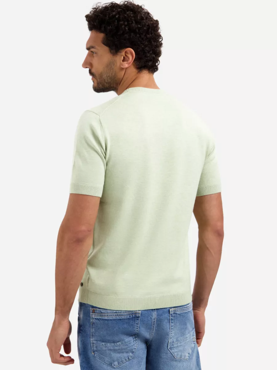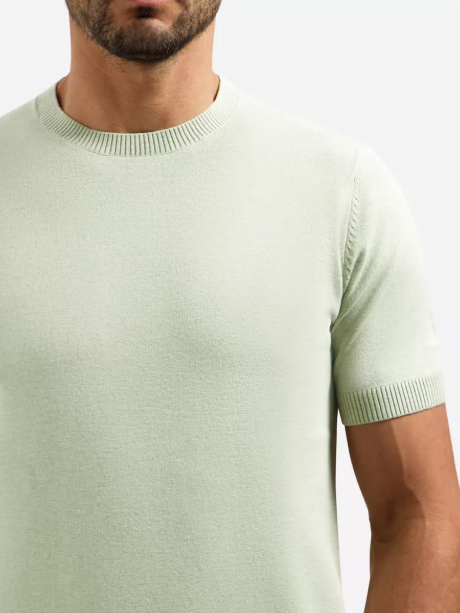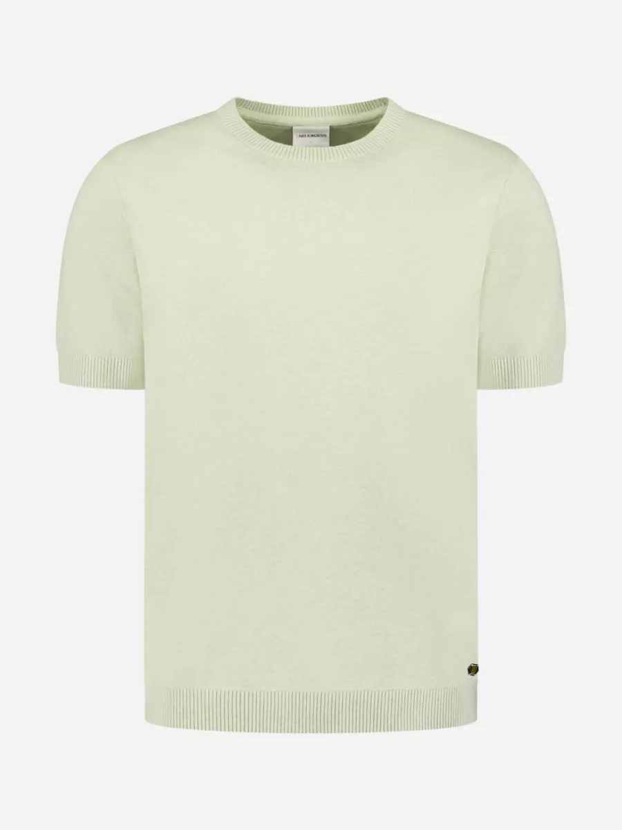 Dit mintgroene heren t-shirt is uitgevoerd in een fijne breikwaliteit met geribbelde afwerking aan de ronde hals, de manchetten en de zoom. De gebreide structuur geeft het stuk een netter karakter dan een regulier katoenen t-shirt, waardoor het ook goed draagbaar is bij een licht geklede gelegenheid. Aan de rechterzijde van de zoom is het logo van No Excess als klein goudkleurig badge bevestigd. De frisse mintgroene kleur past goed bij neutrale en aardetinten. De samenstelling van 34% viscose, 34% katoen en 32% polyester zorgt voor een soepele val en een aangenaam draaggevoel.