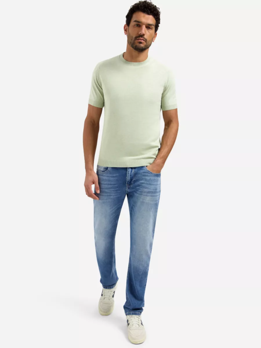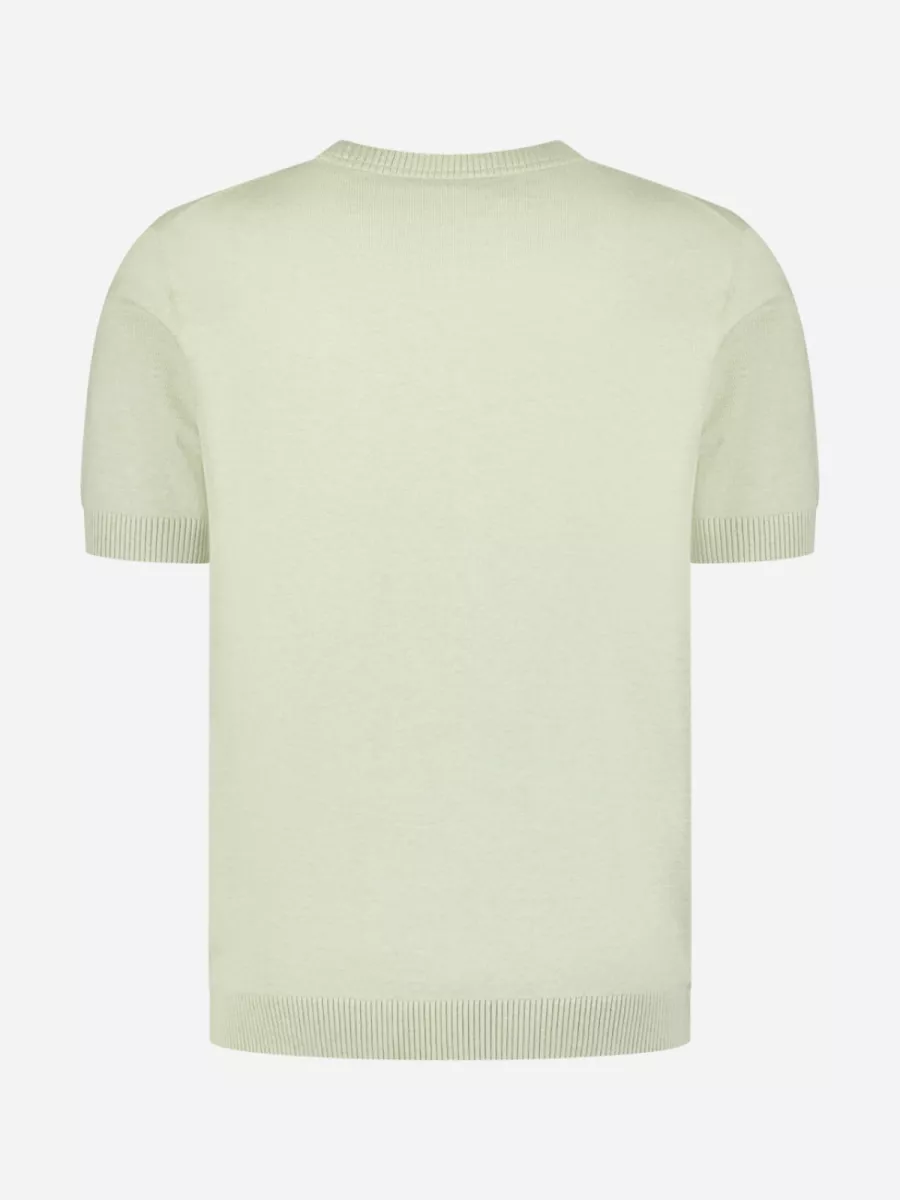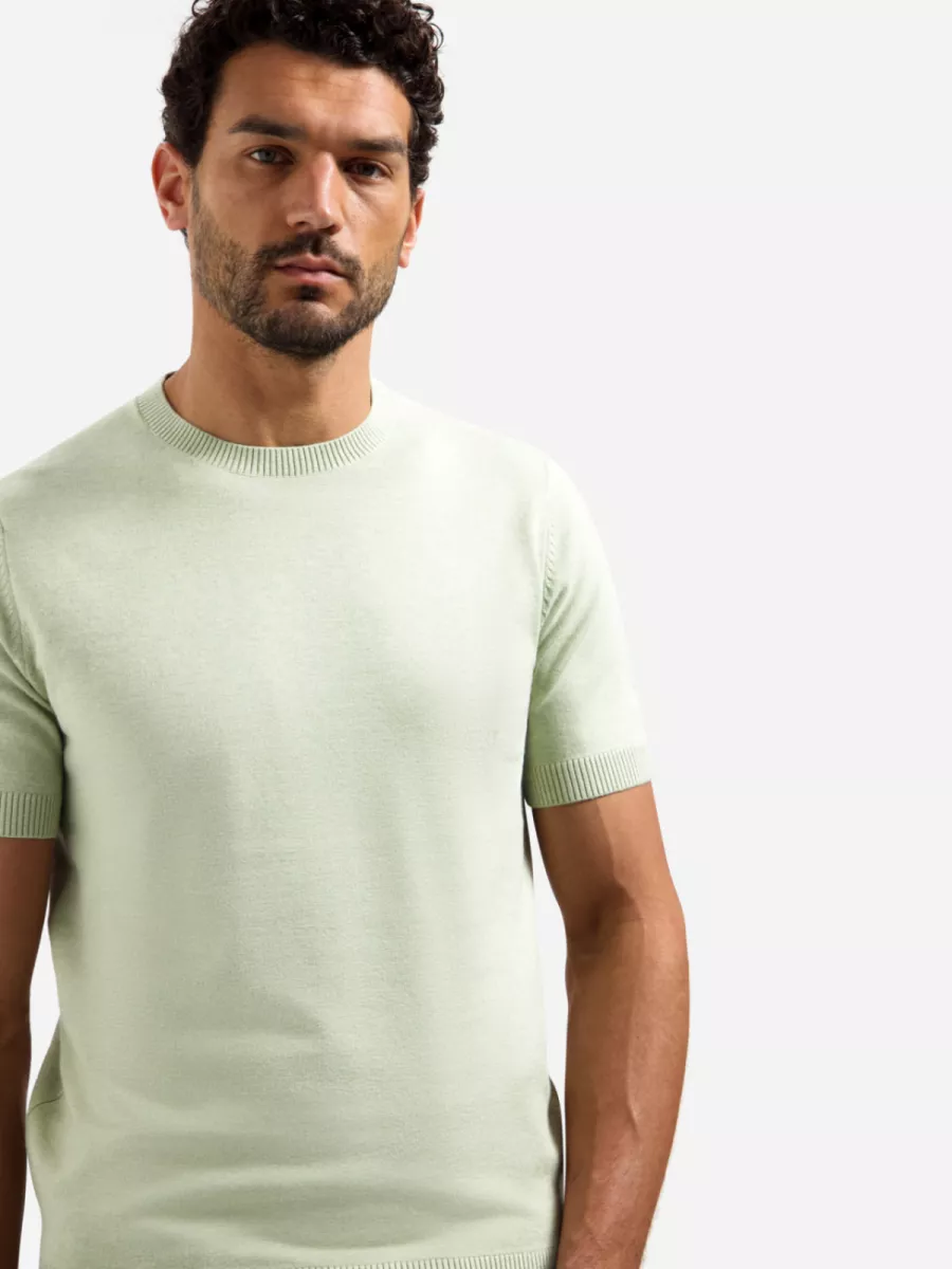 Dit mintgroene heren t-shirt is uitgevoerd in een fijne breikwaliteit met geribbelde afwerking aan de ronde hals, de manchetten en de zoom. De gebreide structuur geeft het stuk een netter karakter dan een regulier katoenen t-shirt, waardoor het ook goed draagbaar is bij een licht geklede gelegenheid. Aan de rechterzijde van de zoom is het logo van No Excess als klein goudkleurig badge bevestigd. De frisse mintgroene kleur past goed bij neutrale en aardetinten. De samenstelling van 34% viscose, 34% katoen en 32% polyester zorgt voor een soepele val en een aangenaam draaggevoel.