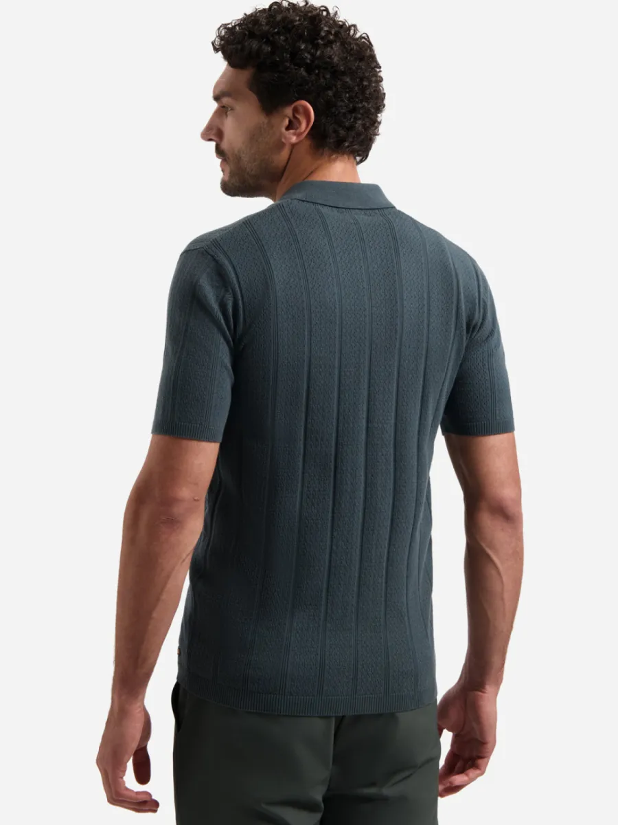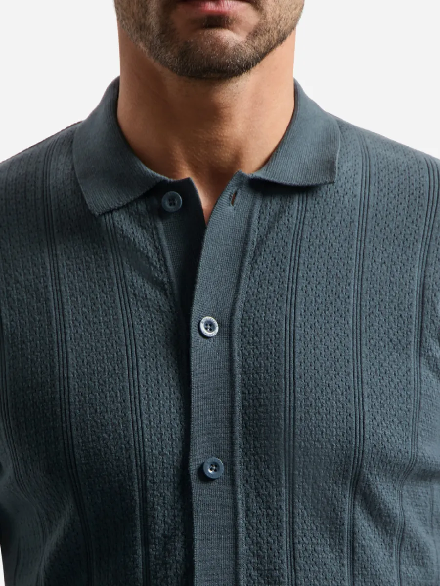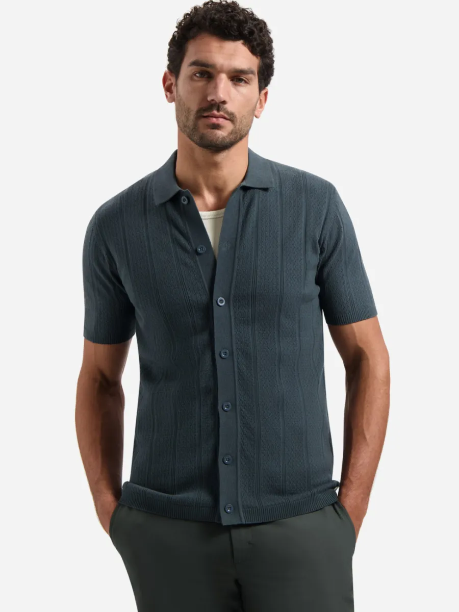 Dit vest is vervaardigd in een fijn gebreide kwaliteit in een gedempte groenblauw-grijze kleur met een doorgaande knoopsluiting. Het breigoed toont een open structuur met afwisselende banen van ajour en gladder breiwerk die verticale panelen vormen. De polokraag en geribbelde manchetten en zoom geven hem een verzorgde afwerking. De pasvorm is regulier met korte mouwen. De samenstelling van 69% katoen en 31% nylon geeft de stof een goede vormbehoud en zachte aanraking.
