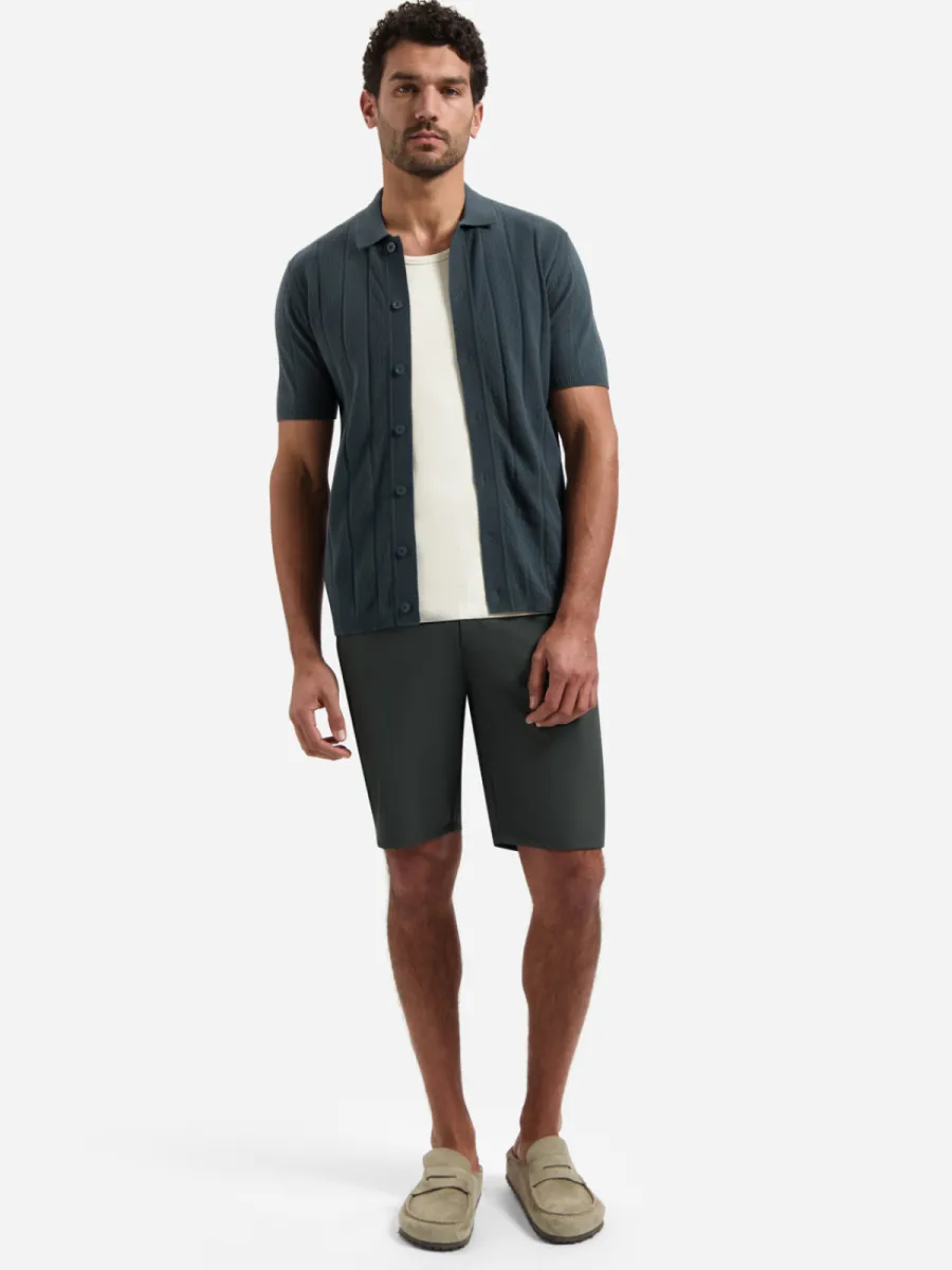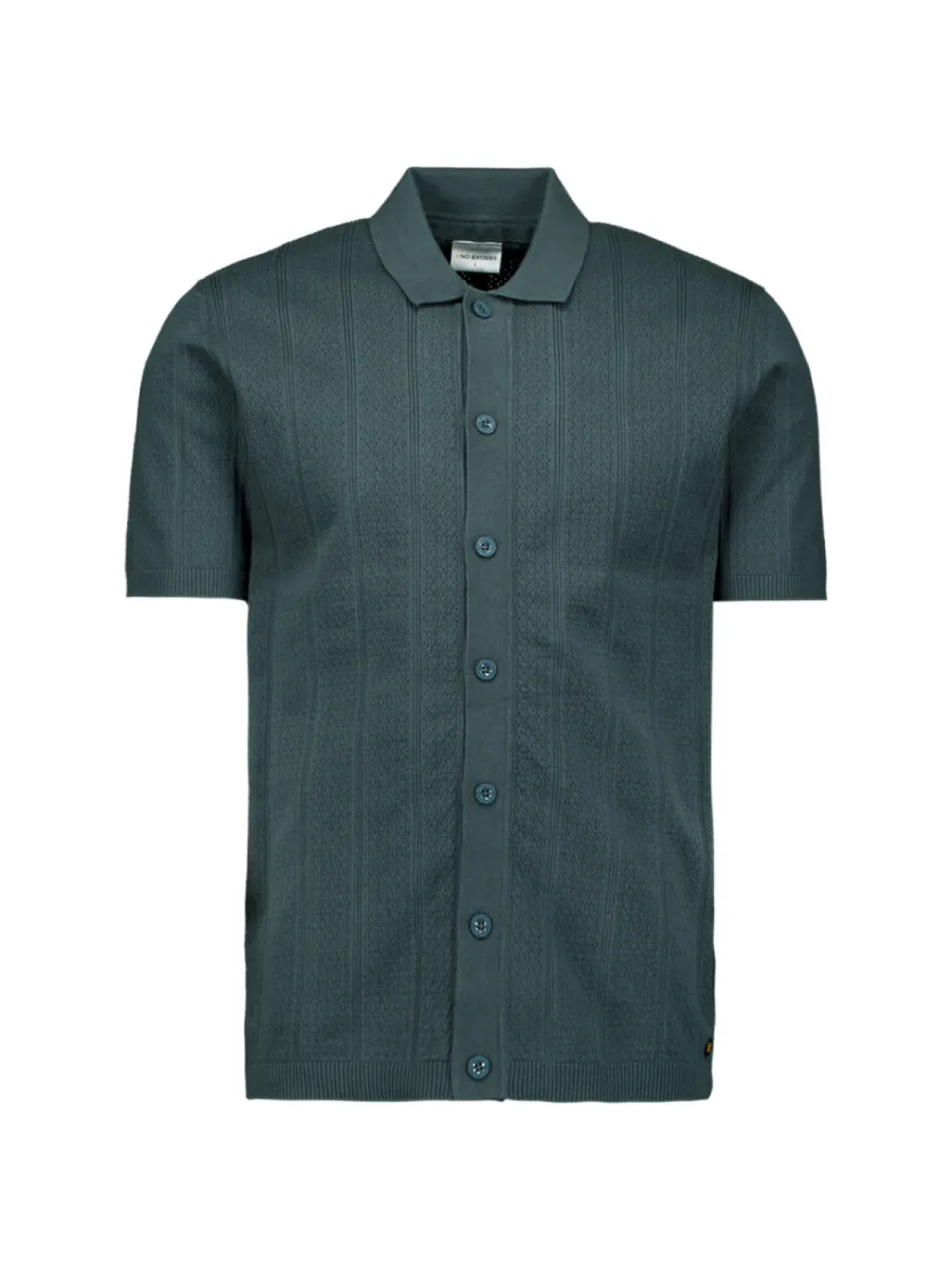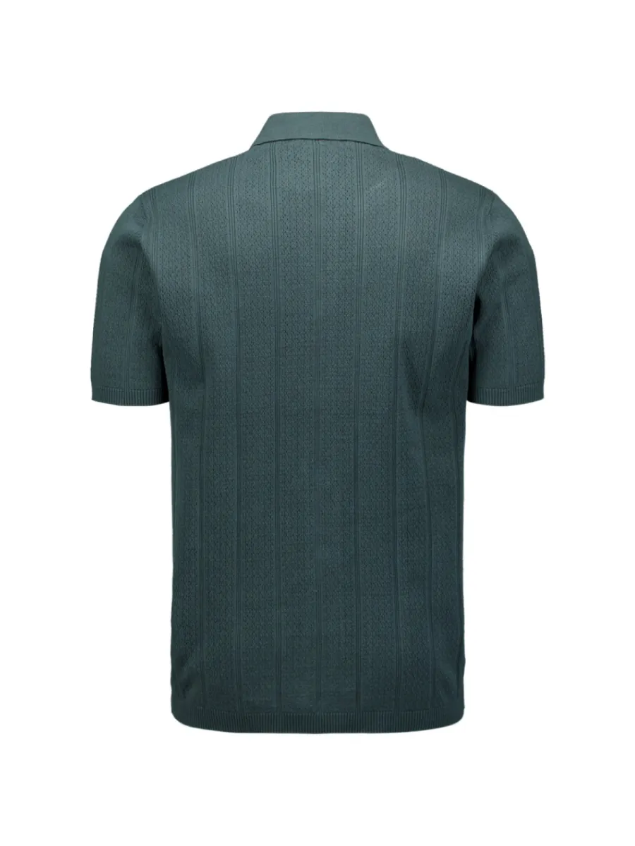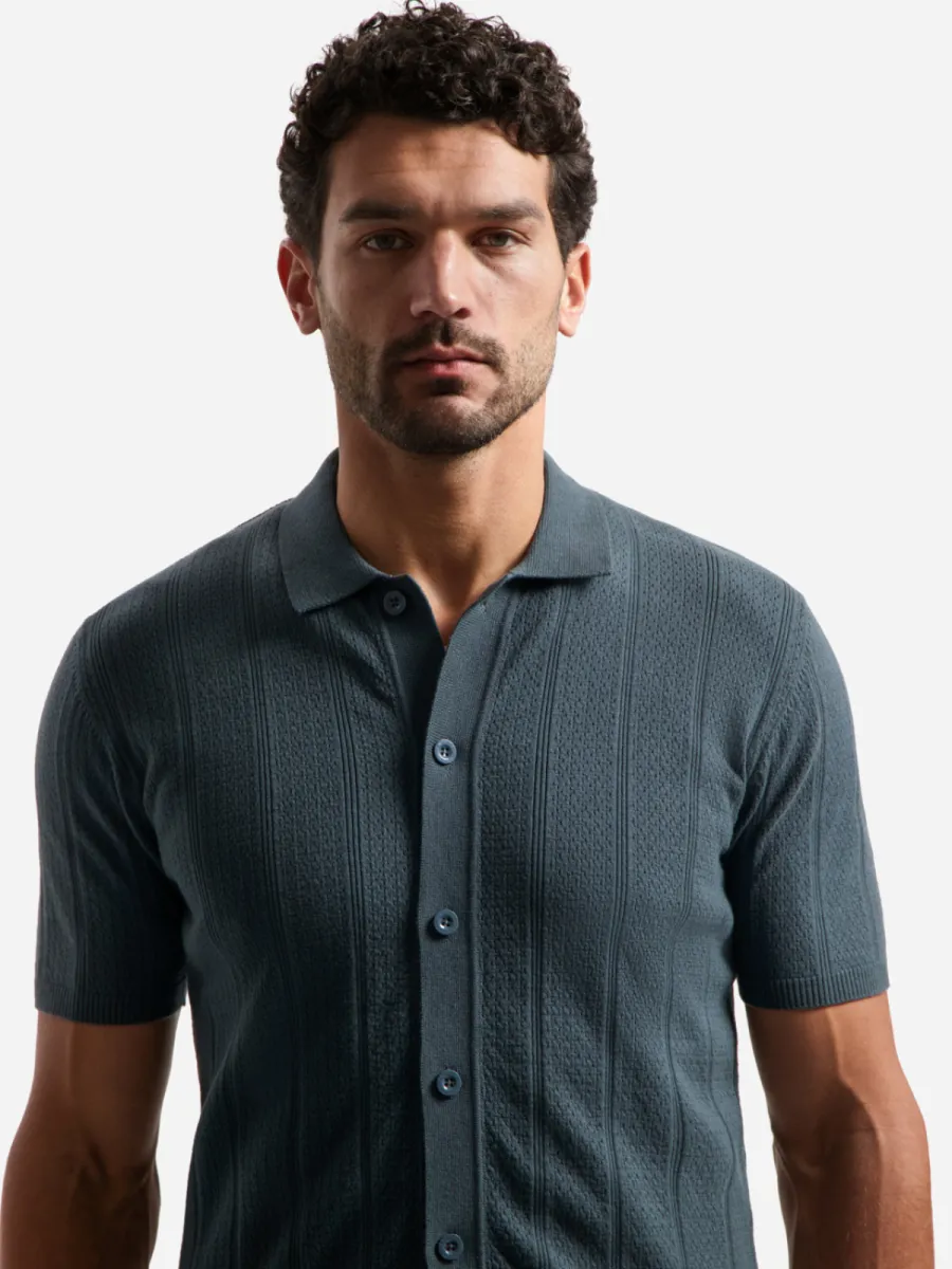 Dit vest is vervaardigd in een fijn gebreide kwaliteit in een gedempte groenblauw-grijze kleur met een doorgaande knoopsluiting. Het breigoed toont een open structuur met afwisselende banen van ajour en gladder breiwerk die verticale panelen vormen. De polokraag en geribbelde manchetten en zoom geven hem een verzorgde afwerking. De pasvorm is regulier met korte mouwen. De samenstelling van 69% katoen en 31% nylon geeft de stof een goede vormbehoud en zachte aanraking.