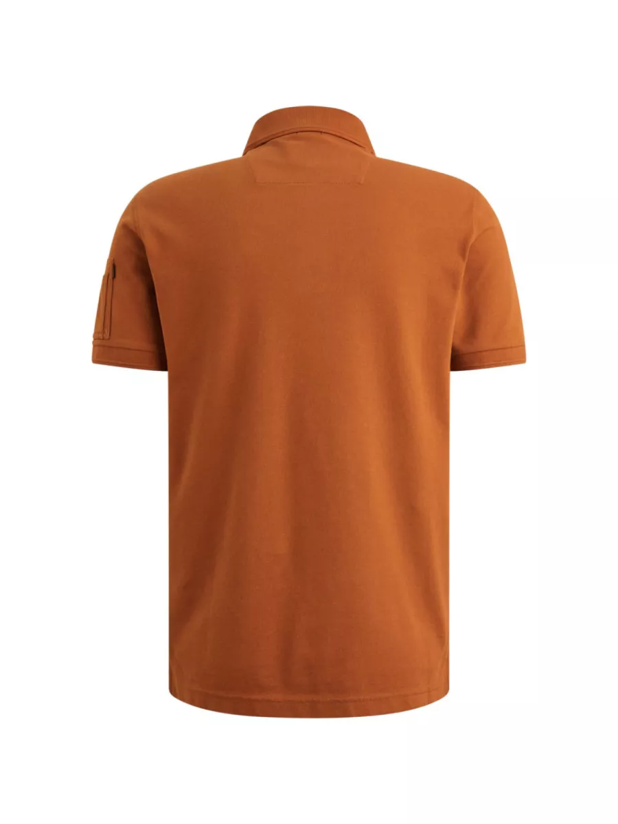 Deze oranje heren polo heeft een klassieke polokraag met een knoopsluiting van drie donkere knopen. Op de linkerborst is het logo van PME Legend bevestigd als klein toonvast vierkant badge. Aan de linkermouw is het logo van PME Legend aangebracht als klein tekstlabel. De stof heeft een subtiele wafelstructuur die het stuk visueel meer diepte geeft dan een gladde polo. De warme oranje kleur combineert goed met donkere jeans of een neutrale broek. De samenstelling van 95% katoen en 5% elastaan zorgt voor een goede pasvorm met enige rekbaarheid.