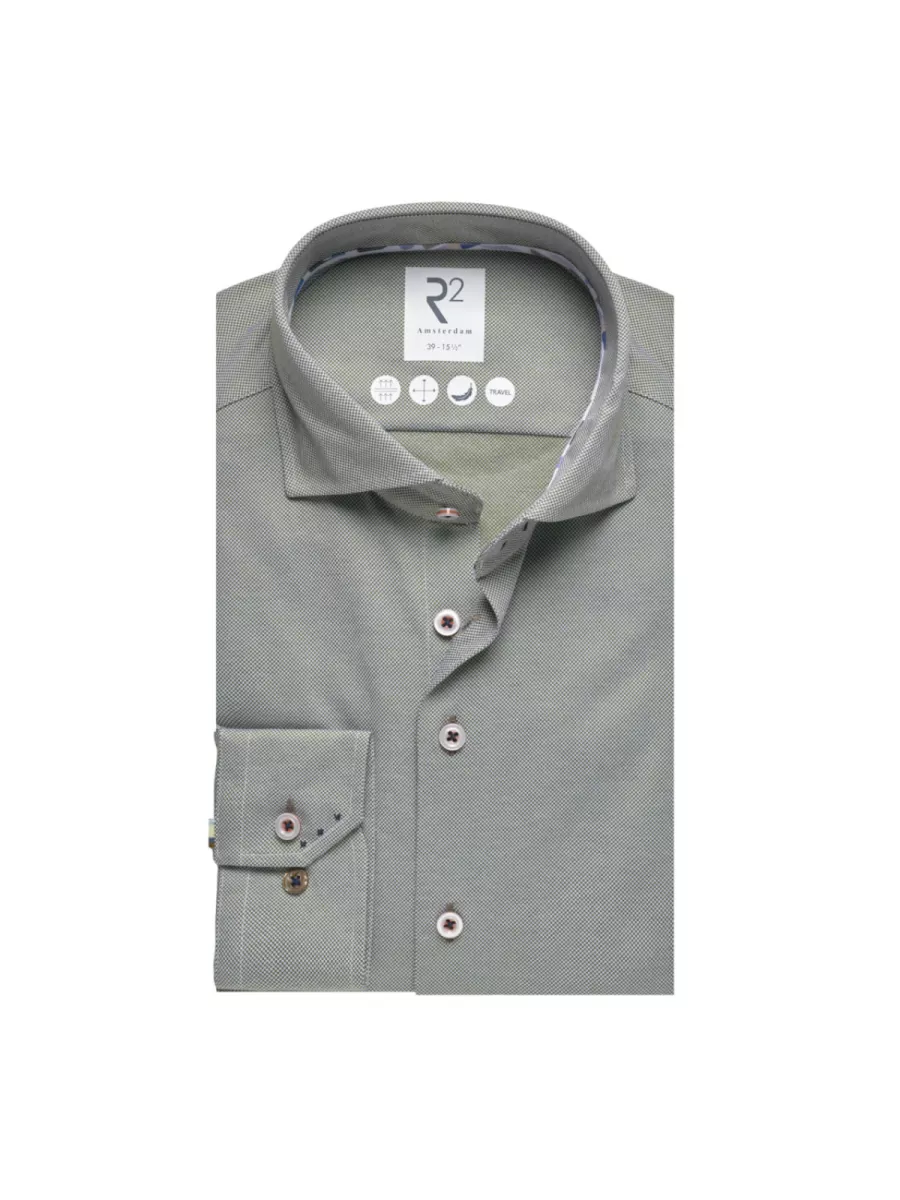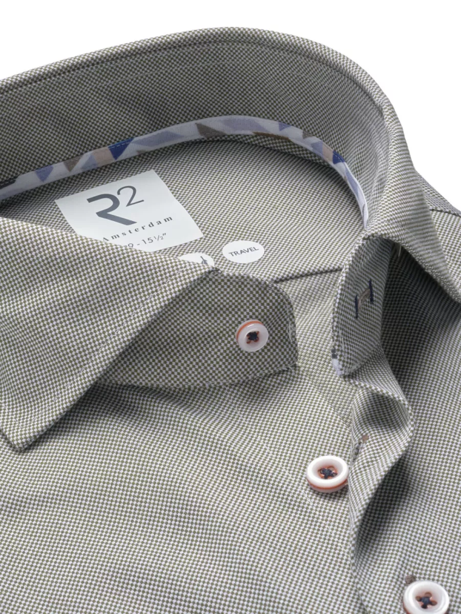 Dit legergroene overhemd van R2 Amsterdam heeft dezelfde fijne oxford-structuurweefsel en getailleerde pasvorm als de blauwe variant. De gedempte groentint geeft het overhemd een aardse, veelzijdige uitstraling die goed combineert met beige, camel of navy. De bruine knopen en de bedrukte binnenkant van de kraag zijn subtiele merkdetails die de kwaliteitsafwerking onderstrepen. Dankzij de Travel-kwaliteit is het overhemd kreukherstellend en hoeft het niet gestreken te worden. Materiaal: 47% Katoen, 53% Polyester.