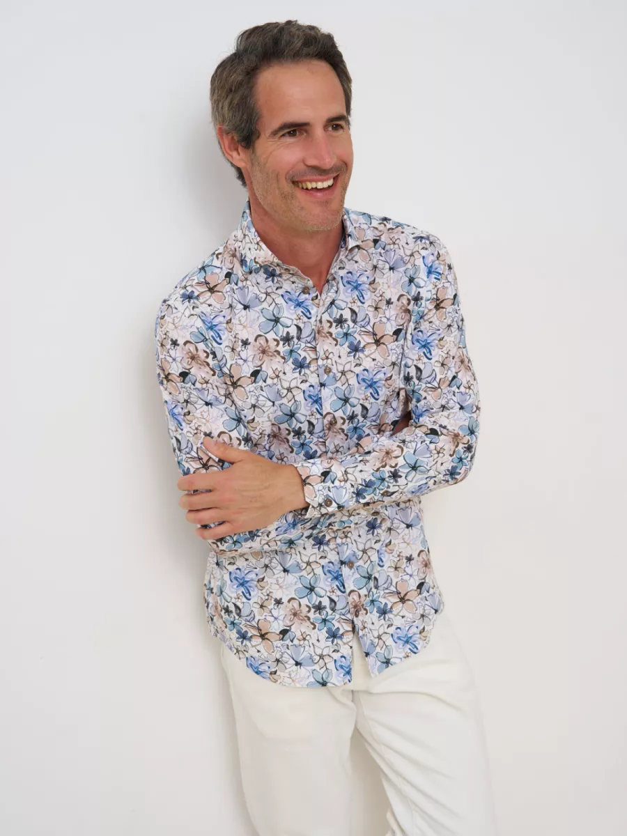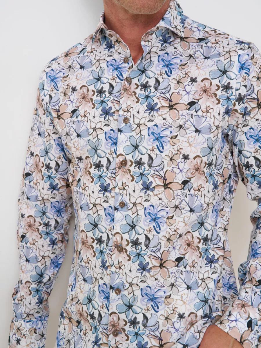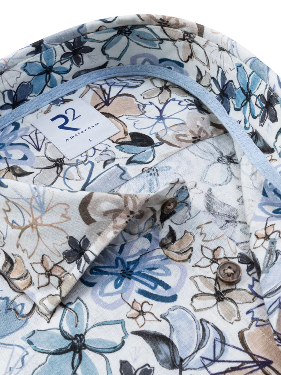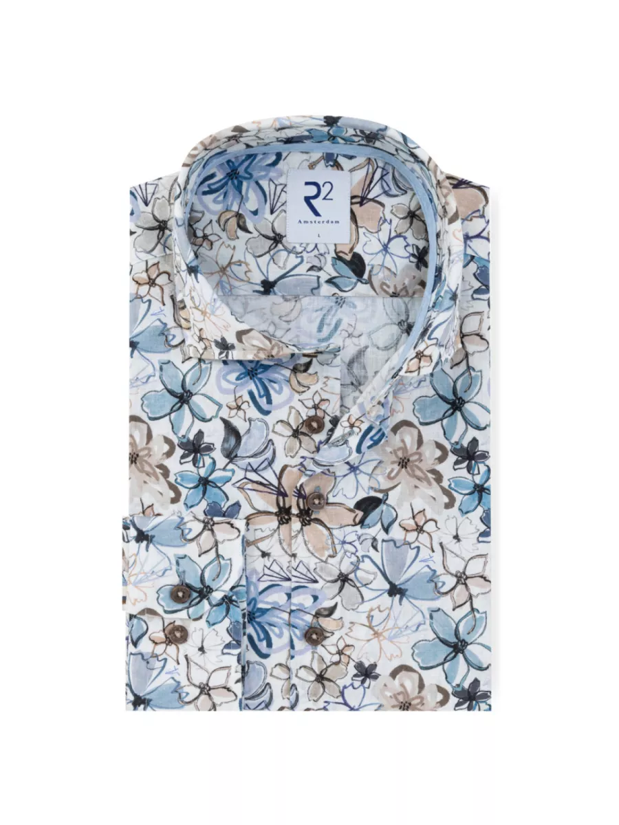 Dit witte linnen overhemd van R2 Amsterdam is voorzien van een groot, losjes geschilderd bloemendessin in blauw, taupe, grijs en zwart. De open bloemen met schetsmatige lijnen en kwaststreken geven het overhemd een artistiek, zomers karakter. De lichtblauwe contrastbiezen op de binnenkant van de kraag en de bruine knopen zijn typische R2-details. Het licht gestructureerde linnenweefsel geeft het overhemd een relaxte, luchtige val die perfect aansluit bij het warme seizoen. Materiaal: 54% Linnen, 44% Katoen, 2% Elastaan.