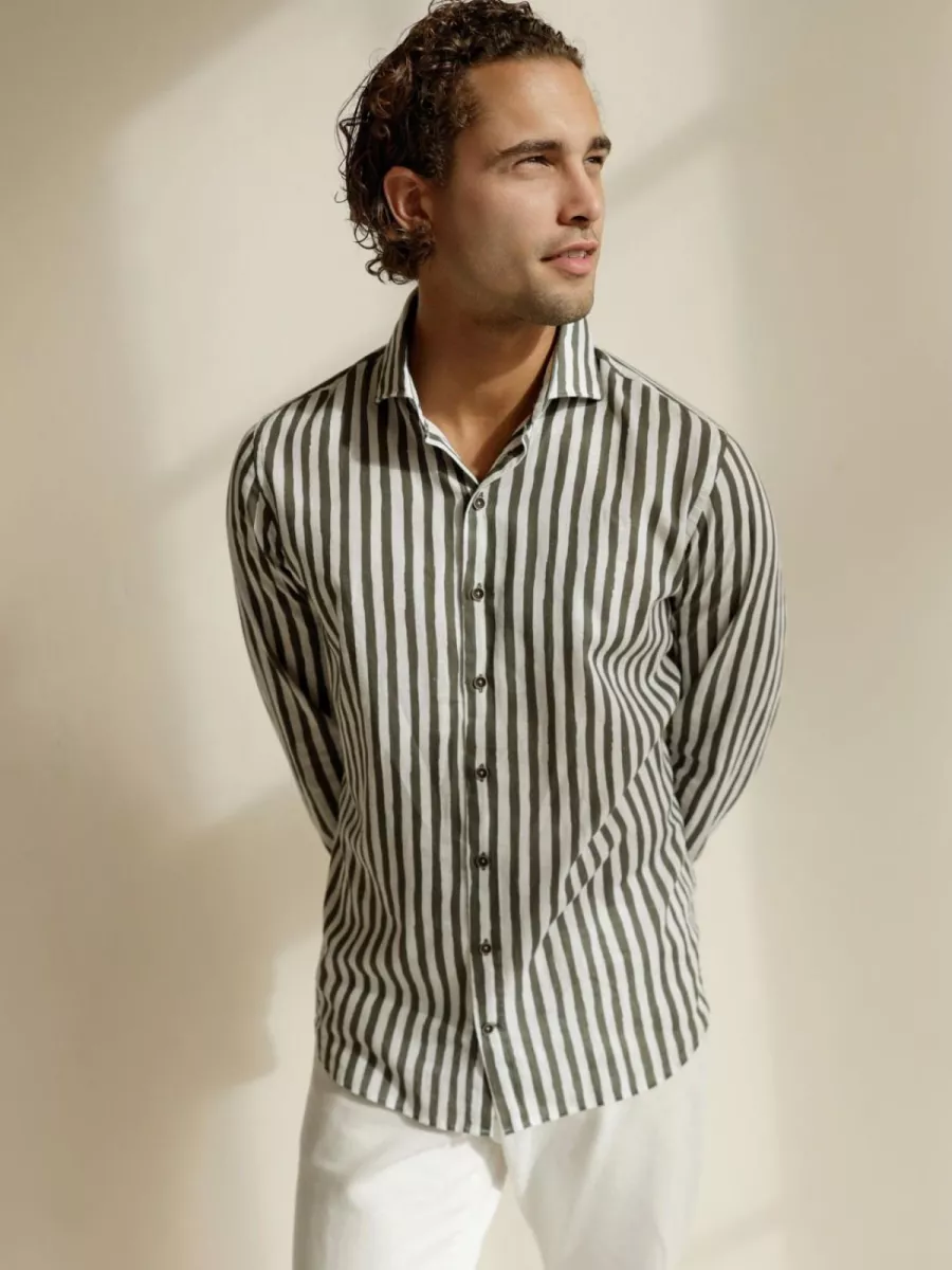 Dit wit-olijfgroen gestreepte overhemd van R2 Amsterdam is de groenere variant in dezelfde linnenserie als de blauwe streep. De brede verticale strepen in olijfgroen en wit geven het overhemd een frisse, eigentijdse uitstraling. De bloemenbedrukte binnenkant van de kraag, de donkerbruine knopen en de gekleurde R2-vlag op de manchet zijn kenmerkende R2-details. Het luchtige linnenweefsel met een vleugje elastaan zorgt voor aangenaam draagcomfort op warme dagen. Combineert goed met een beige, witte of ecru broek. Materiaal: 54% Linnen, 44% Katoen, 2% Elastaan.